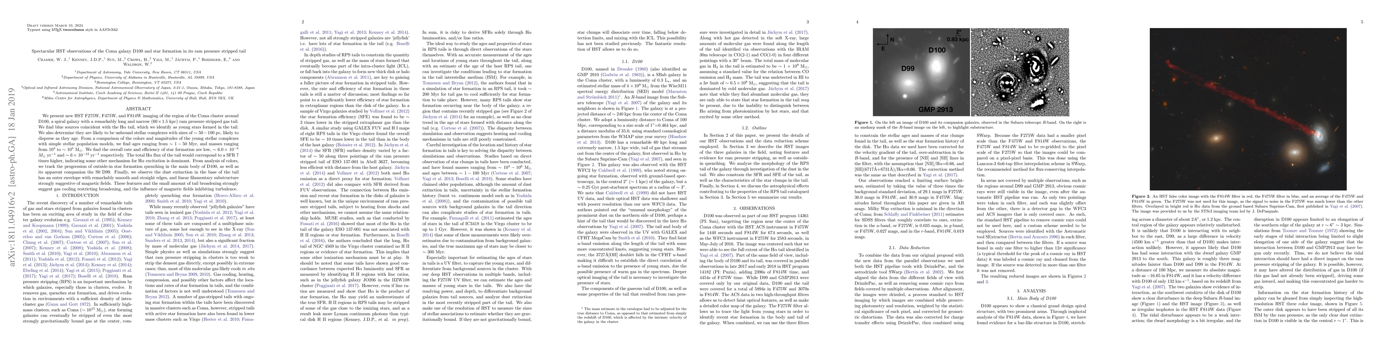 We present new HST F275W, F475W, and F814W imaging of the region of the Coma cluster around D100, a spiral galaxy with a remarkably long and narrow ($60 \times 1.5$ kpc) ram pressure stripped gas tail. We find blue sources coincident with the H$\alpha$ tail, which we identify as young stars formed in the tail. We also determine they are likely to be unbound stellar complexes with sizes of $\sim$ $50-100$ pc, likely to disperse as they age. From a comparison of the colors and magnitudes of the young stellar complexes with simple stellar population models, we find ages ranging from $\sim$ $1-50$ Myr, and masses ranging from $10^3$ to $\sim$ $10^5$ M$_{\odot}$. We find the overall rate and efficiency of star formation are low, $\sim$ $6.0 \times \, 10^{-3}$ $M_{\odot}$ yr$^{-1}$ and $\sim$ $6 \, \times$ 10$^{-12}$ yr$^{-1}$ respectively. The total H$\alpha$ flux of the tail would correspond to a star formation rate $7$ times higher, indicating some other mechanism for H$\alpha$ excitation is dominant. From analysis of colors, we track the progression of outside-in star formation quenching in the main body of D100, as well as its apparent companion the S0 D99. Finally, we observe the dust extinction in the base of the tail has an outer envelope with remarkably smooth and straight edges, and linear filamentary substructure strongly suggestive of magnetic fields. These features and the small amount of tail broadening strongly suggest gas cooling restricting broadening, and the influence of magnetic fields inhibiting turbulence.