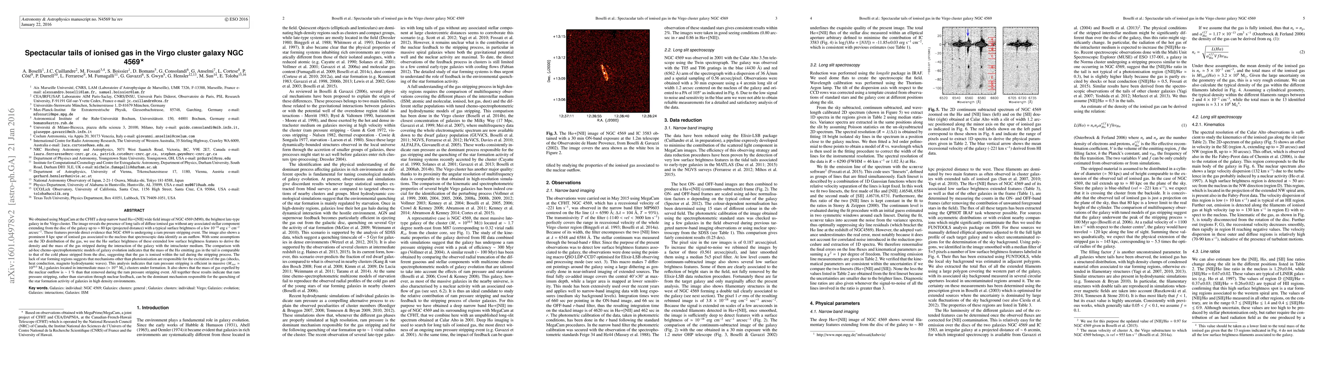 We obtained using MegaCam at the CFHT a deep narrow band Halpha+[NII] wide field image of NGC 4569, the brightest late-type galaxy in the Virgo cluster. The image reveals the presence of long tails of diffuse ionised gas without any associated stellar component extending from the disc of the galaxy up to ~ 80 kpc (projected distance) with a typical surface brightness of a few 10^-18 erg s-1 cm-2 arcsec-2. These features provide direct evidence that NGC 4569 is undergoing a ram presure stripping event. The image also shows a prominent 8 kpc spur of ionised gas associated to the nucleus that spectroscopic data identify as an outflow. With some assumptions on the 3D distribution of the gas, we use the Halpha surface brightness of these extended low surface brightness features to derive the density and the mass of the gas stripped during the interaction of the galaxy with the ICM. The comparison with ad-hoc chemo-spectrophotometric models of galaxy evolution indicates that the mass of the Halpha emitting gas in the tail is comparable to that of the cold phase stripped from the disc, suggesting that the gas is ionised within the tail during the stripping process. The lack of star forming regions suggests that mechanisms other than photoionisation are responsible for the excitation of the gas (shocks, heat conduction, magneto hydrodynamic waves). This analysis indicates that ram pressure stripping is efficient in massive (M_star ~ 10^10.5 Mo) galaxies located in intermediate mass (~ 10^14 Mo) clusters under formation. It also shows that the mass of gas expelled by the nuclear outflow is ~ 1 % than that removed during the ram pressure stripping event. All together these results indicate that ram pressure stripping, rather than starvation through nuclear feedback, can be the dominant mechanism responsible for the quenching of the star formation activity of galaxies in high density environments.