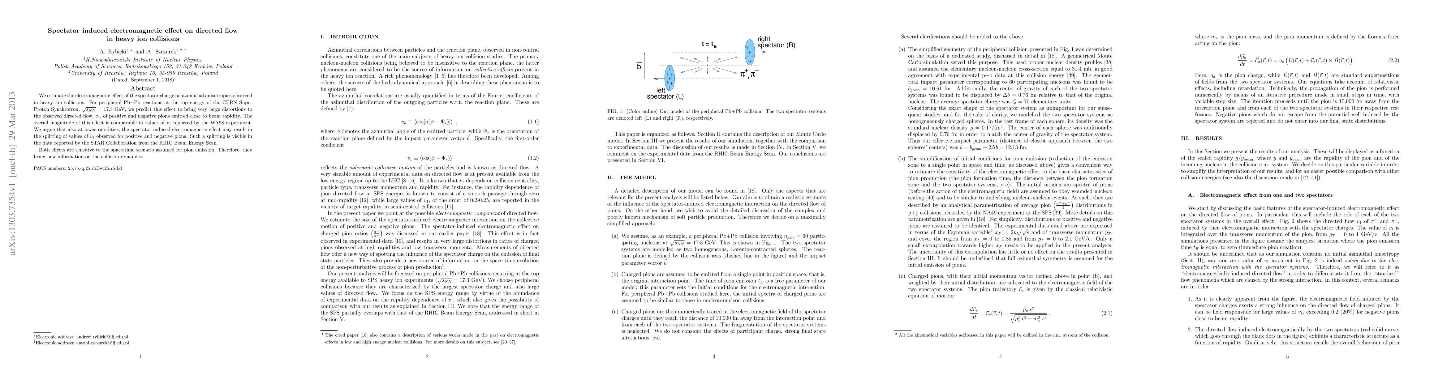 We estimate the electromagnetic effect of the spectator charge on azimuthal anisotropies observed in heavy ion collisions. For peripheral Pb+Pb reactions at the top energy of the CERN Super Proton Synchrotron, $\sqrt{s_{NN}}=17.3$ GeV, we predict this effect to bring very large distortions to the observed directed flow, $v_1$, of positive and negative pions emitted close to beam rapidity. The overall magnitude of this effect is comparable to values of $v_1$ reported by the WA98 experiment. We argue that also at lower rapidities, the spectator induced electromagnetic effect may result in the splitting of values of $v_1$ observed for positive and negative pions. Such a splitting is visible in the data reported by the STAR Collaboration from the RHIC Beam Energy Scan. Both effects are sensitive to the space-time scenario assumed for pion emission. Therefore, they bring new information on the collision dynamics.