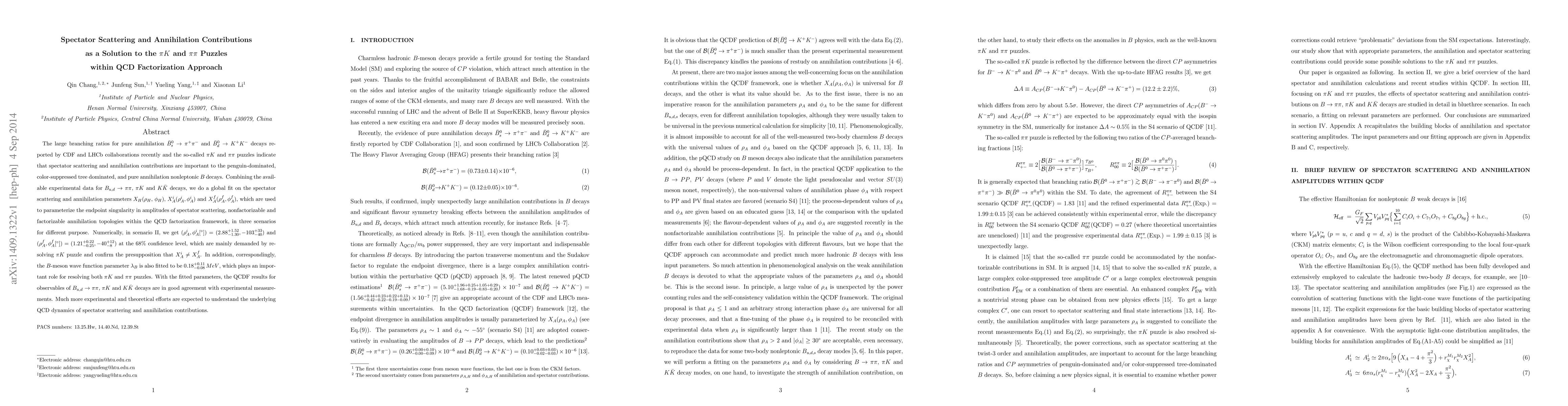 This paper investigates the importance of spectator scattering and annihilation contributions to resolving the ${\pi}K$ and ${\pi}{\pi}$ puzzles in $B$ meson decays, using a QCD factorization approach. The study fits parameters to experimental data, finding that these contributions are crucial for explaining the observed decay rates, and confirming the distinction between different annihilation mechanisms.
