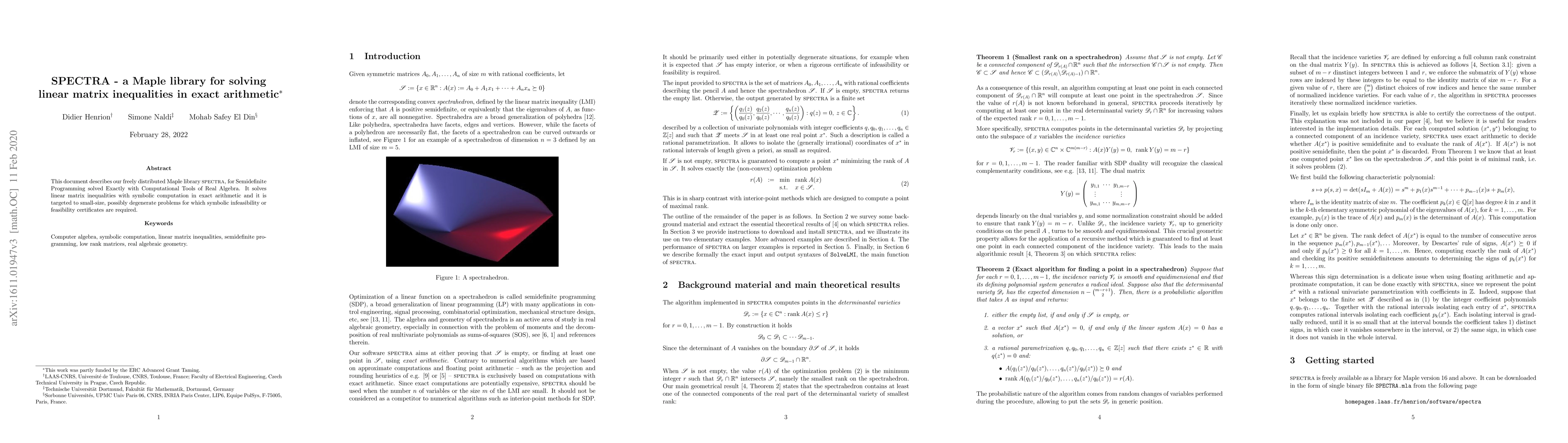 Summary: The SPECTRA library for Maple provides exact arithmetic solutions for small-size linear matrix inequalities, focusing on symbolic computation for semidefinite programming and generating certificates of feasibility or infeasibility. It is freely distributed and designed for precise, exact symbolic results.