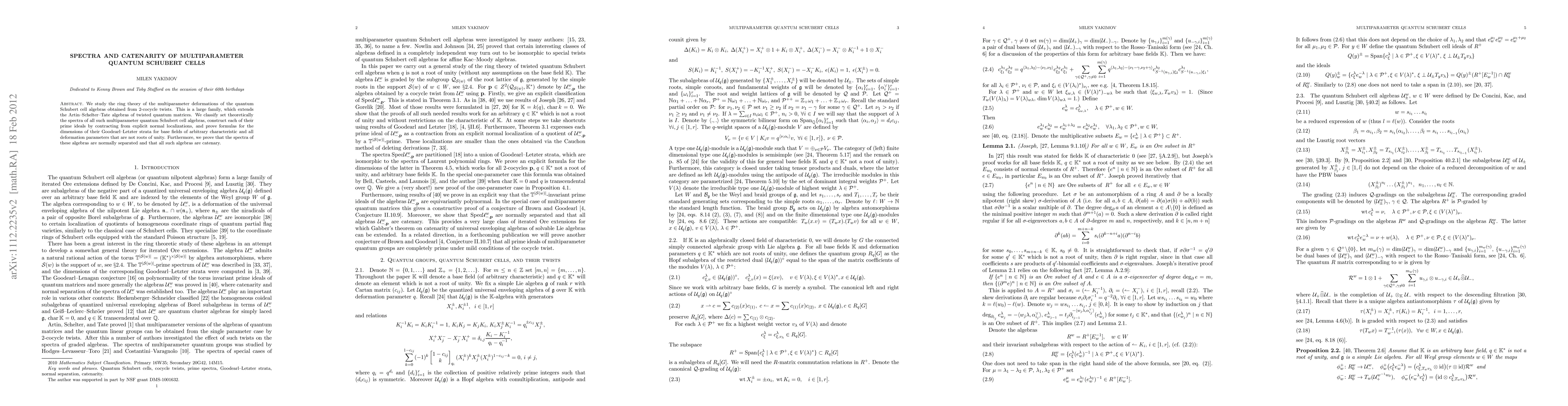 This paper classifies the spectra of multiparameter deformations of quantum Schubert cell algebras, constructs their prime ideals, and proves their catenarity and normal separation, providing formulas for the dimensions of their Goodearl-Letzter strata across various characteristics and deformation parameters.