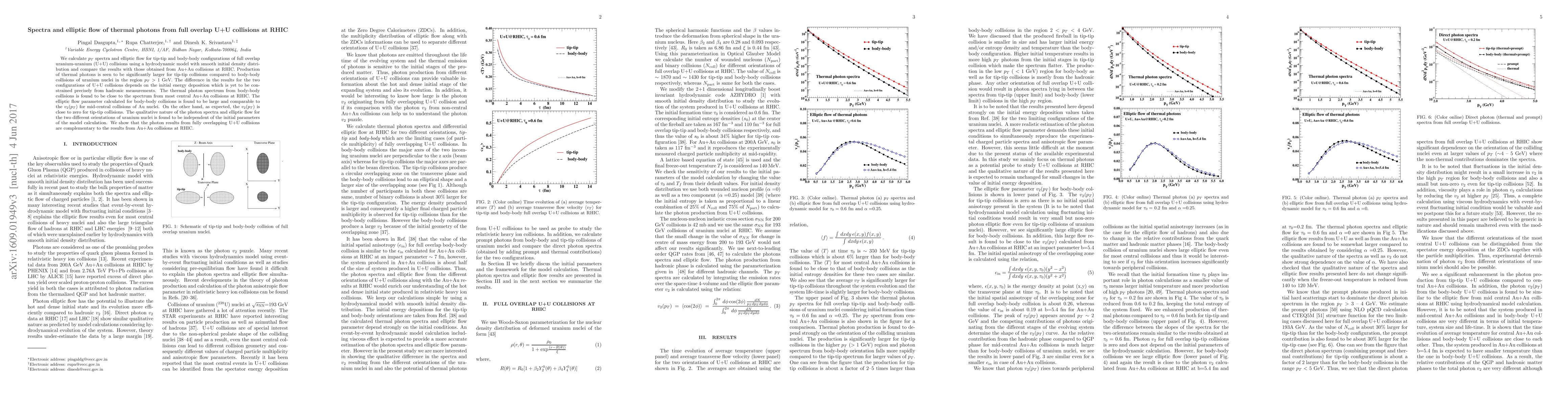 We calculate $p_T$ spectra and elliptic flow for tip-tip and body-body configurations of full overlap uranium-uranium (U+U) collisions using a hydrodynamic model with smooth initial density distribution and compare the results with those obtained from Au+Au collisions at RHIC. Production of thermal photons is seen to be significantly larger for tip-tip collisions compared to body-body collisions of uranium nuclei in the region $p_T >$ 1 GeV. The thermal photon spectrum from body-body collisions is found to be close to the spectrum from most central Au+Au collisions at RHIC. The elliptic flow parameter calculated for body-body collisions is found to be large and comparable to the $v_2(p_T)$ for mid-central collisions of Au nuclei. On the other hand, as expected, the $v_2(p_T)$ is close to zero for tip-tip collisions. The qualitative nature of the photon spectra and elliptic flow for the two different orientations of uranium nuclei is found to be independent of the initial parameters of the model calculation. We show that the photon results from fully overlapping U+U collisions are complementary to the results from Au+Au collisions at RHIC.