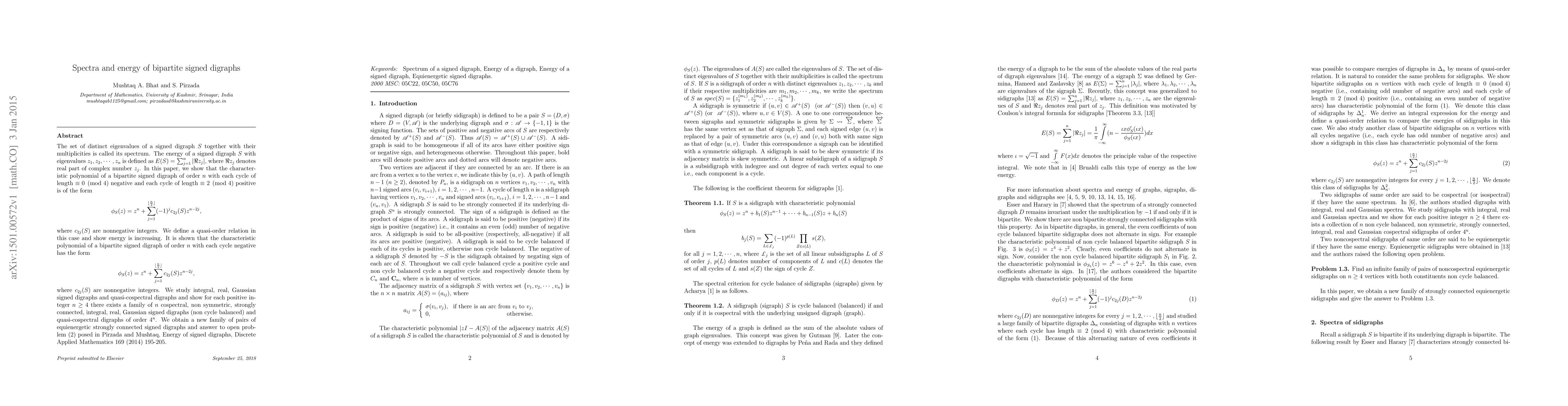 The set of distinct eigenvalues of a signed digraph $S$ together with their multiplicities is called its spectrum. The energy of a signed digraph $S$ with eigenvalues $z_1,z_2,\cdots,z_n$ is defined as $E(S)=\sum_{j=1}^{n}|\Re z_j|$, where $\Re z_j $ denotes real part of complex number $z_j$. In this paper, we show that the characteristic polynomial of a bipartite signed digraph of order $n$ with each cycle of length $\equiv 0\pmod 4$ negative and each cycle of length $\equiv 2\pmod 4$ positive is of the form \\ $$\phi_S(z)=z^n+\sum\limits_{j=1}^{\lfloor{\frac{n}{2}}\rfloor}(-1)^j c_{2j}(S)z^{n-2j},$$\\ where $c_{2j}(S)$ are nonnegative integers. We define a quasi-order relation in this case and show energy is increasing. It is shown that the characteristic polynomial of a bipartite signed digraph of order $n$ with each cycle negative has the form $$\phi_S(z)=z^n+\sum\limits_{j=1}^{\lfloor{\frac{n}{2}}\rfloor}c_{2j}(S)z^{n-2j},$$ where $c_{2j}(S)$ are nonnegative integers. We study integral, real, Gaussian signed digraphs and quasi-cospectral digraphs and show for each positive integer $n\ge 4$ there exists a family of $n$ cospectral, non symmetric, strongly connected, integral, real, Gaussian signed digraphs (non cycle balanced) and quasi-cospectral digraphs of order $4^n$. We obtain a new family of pairs of equienergetic strongly connected signed digraphs and answer to open problem $(2)$ posed in Pirzada and Mushtaq, Energy of signed digraphs, Discrete Applied Mathematics 169 (2014) 195-205.