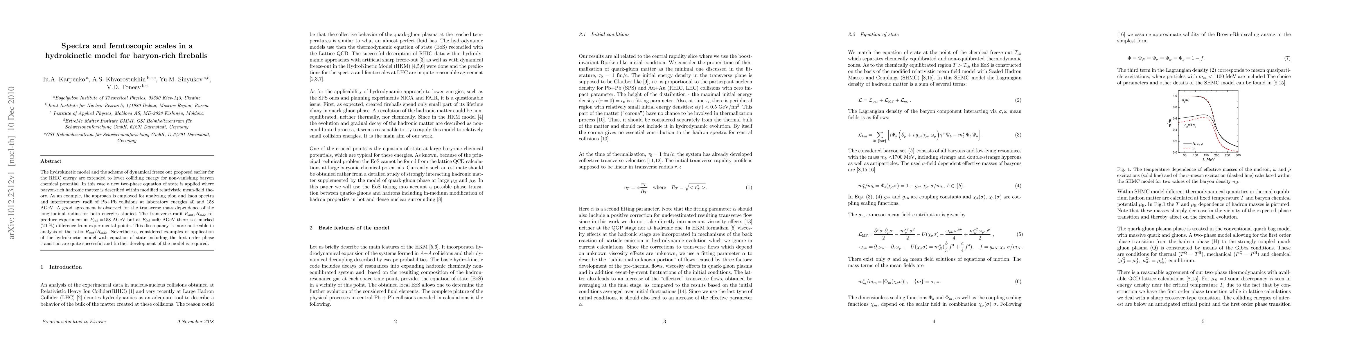 This paper extends a hydrokinetic model to lower collision energies with non-zero baryon chemical potential, applying a new two-phase equation of state. It analyzes pion and kaon spectra and interferometry radii from Pb+Pb collisions, showing good agreement for most results but a notable discrepancy at lower energies.