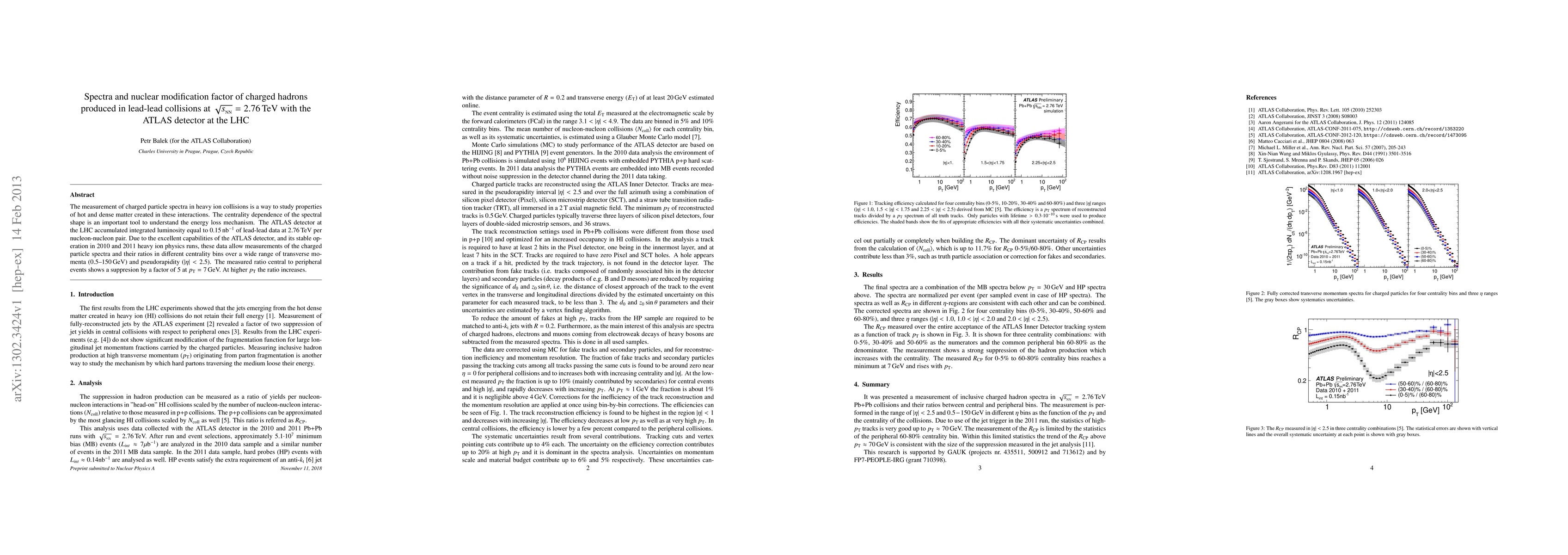 This paper reports on the measurement of charged hadron spectra in lead-lead collisions at 2.76 TeV using the ATLAS detector at the LHC, revealing significant nuclear modification factors and centrality dependence, indicating substantial energy loss in dense matter at lower transverse momenta. The suppression factor peaks at 7 GeV, suggesting a transition in energy loss mechanisms at higher momenta.