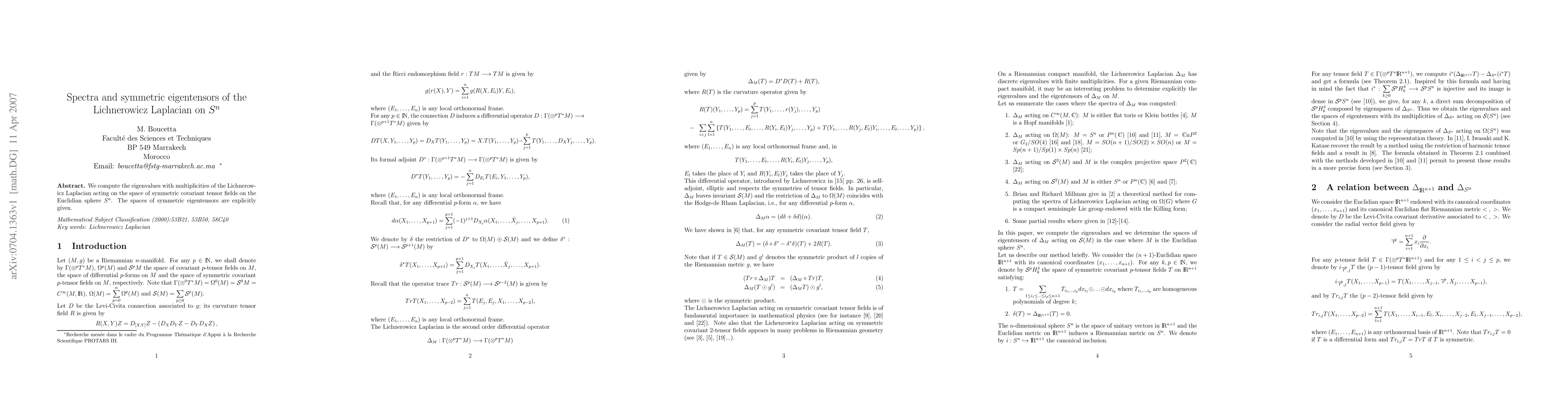 This paper computes the eigenvalues and multiplicities of the Lichnerowicz Laplacian on $S^n$ for symmetric covariant tensor fields, and provides explicit representations of the corresponding eigentensor spaces.