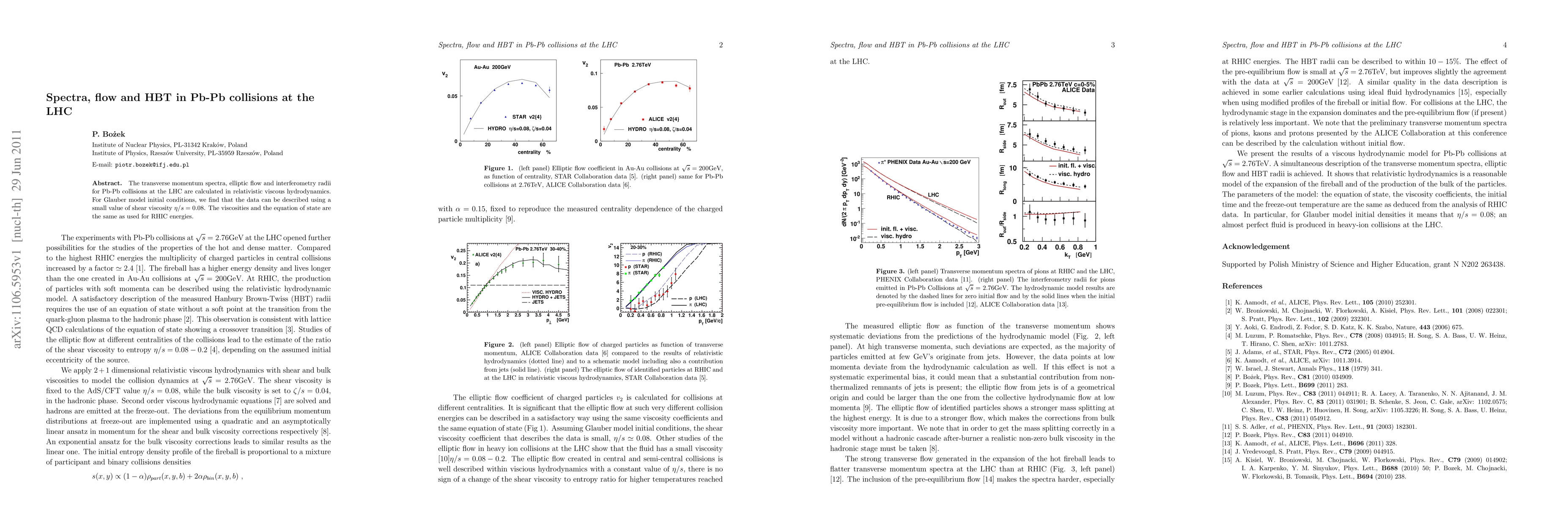 This paper investigates Pb-Pb collisions at the LHC using relativistic viscous hydrodynamics, finding that the transverse momentum spectra, elliptic flow, and HBT radii align with data using a small shear viscosity ratio of η/s = 0.08, consistent with RHIC energies.