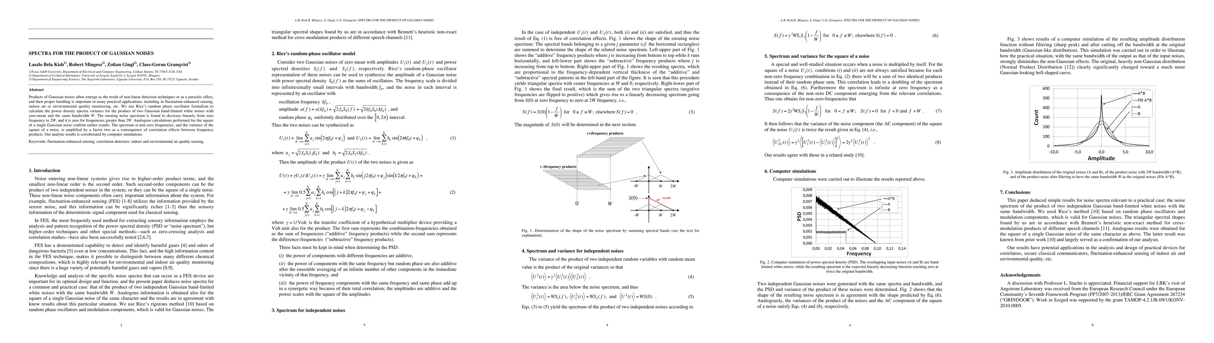 This paper calculates the power density spectra variance for the product of two Gaussian band-limited white noises, finding a linearly decreasing spectrum from zero to twice the bandwidth, and zero beyond. It also confirms that the square of a single Gaussian noise spectrum is amplified by a factor of two due to correlation effects, validated by computer simulations.
