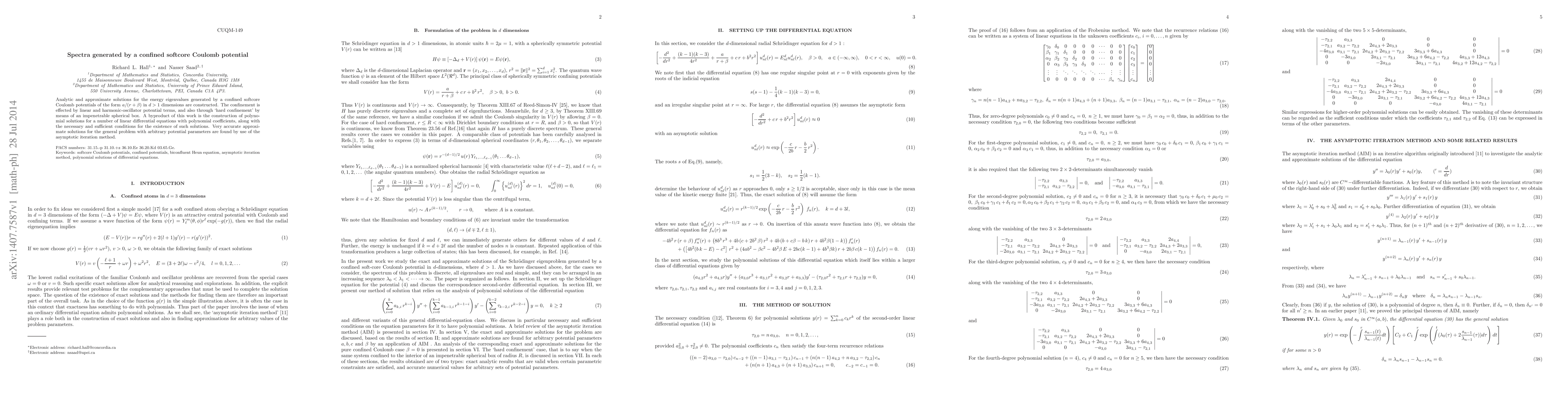 Analytic and approximate solutions for the energy eigenvalues generated by a confined softcore Coulomb potentials of the form a/(r+\beta) in d>1 dimensions are constructed. The confinement is effected by linear and harmonic-oscillator potential terms, and also through `hard confinement' by means of an impenetrable spherical box. A byproduct of this work is the construction of polynomial solutions for a number of linear differential equations with polynomial coefficients, along with the necessary and sufficient conditions for the existence of such solutions. Very accurate approximate solutions for the general problem with arbitrary potential parameters are found by use of the asymptotic iteration method.