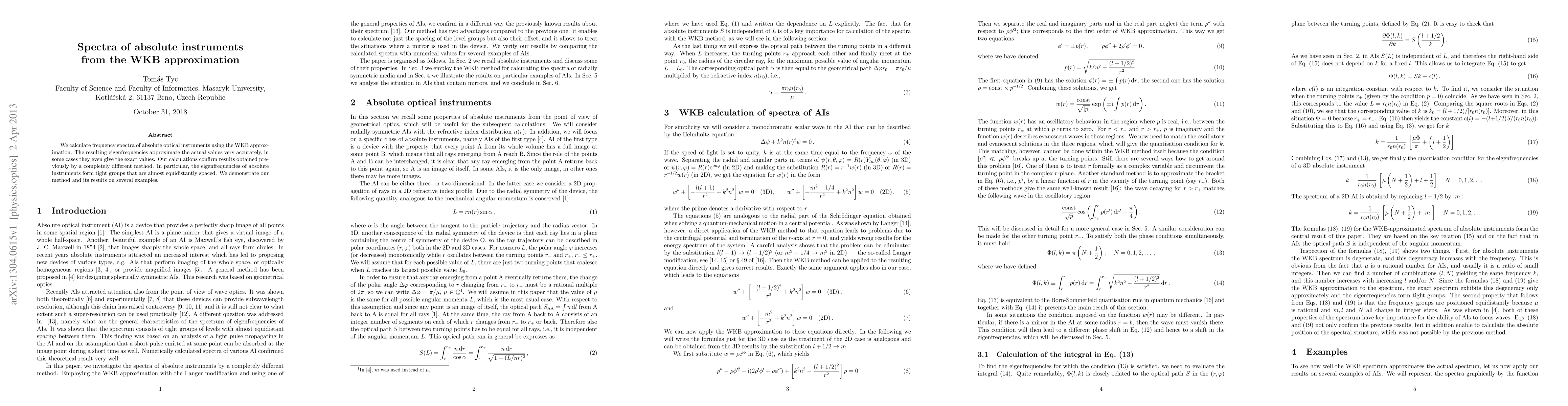 This paper calculates the frequency spectra of absolute optical instruments using the WKB approximation, showing that the resulting eigenfrequencies closely match actual values, sometimes exactly. The method confirms previous findings and reveals tightly grouped, nearly equidistant eigenfrequencies.