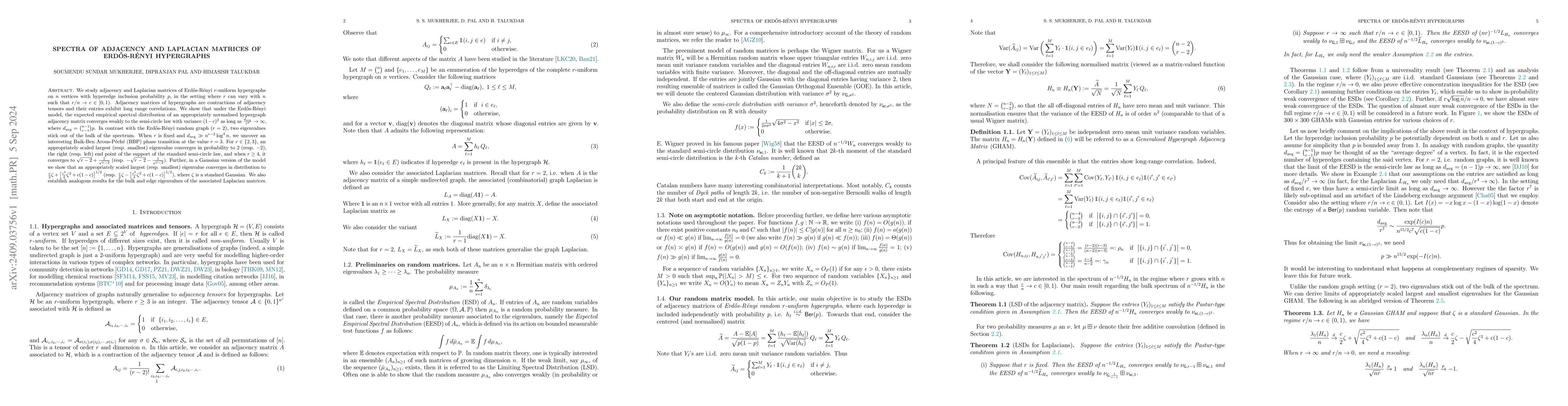 We study adjacency and Laplacian matrices of Erd\H{o}s-R\'{e}nyi $r$-uniform hypergraphs on $n$ vertices with hyperedge inclusion probability $p$, in the setting where $r$ can vary with $n$ such that $r / n \to c \in [0, 1)$. Adjacency matrices of hypergraphs are contractions of adjacency tensors and their entries exhibit long range correlations. We show that under the Erd\H{o}s-R\'{e}nyi model, the expected empirical spectral distribution of an appropriately normalised hypergraph adjacency matrix converges weakly to the semi-circle law with variance $(1 - c)^2$ as long as $\frac{d_{\avg}}{r^7} \to \infty$, where $d_{\avg} = \binom{n-1}{r-1} p$. In contrast with the Erd\H{o}s-R\'{e}nyi random graph ($r = 2$), two eigenvalues stick out of the bulk of the spectrum. When $r$ is fixed and $d_{\avg} \gg n^{r - 2} \log^4 n$, we uncover an interesting Baik-Ben Arous-P\'{e}ch\'{e} (BBP) phase transition at the value $r = 3$. For $r \in \{2, 3\}$, an appropriately scaled largest (resp. smallest) eigenvalue converges in probability to $2$ (resp. $-2$), the right (resp. left) end point of the support of the standard semi-circle law, and when $r \ge 4$, it converges to $\sqrt{r - 2} + \frac{1}{\sqrt{r - 2}}$ (resp. $-\sqrt{r - 2} - \frac{1}{\sqrt{r - 2}}$). Further, in a Gaussian version of the model we show that an appropriately scaled largest (resp. smallest) eigenvalue converges in distribution to $\frac{c}{2} \zeta + \big[\frac{c^2}{4}\zeta^2 + c(1 - c)\big]^{1/2}$ (resp. $\frac{c}{2} \zeta - \big[\frac{c^2}{4}\zeta^2 + c(1 - c)\big]^{1/2}$), where $\zeta$ is a standard Gaussian. We also establish analogous results for the bulk and edge eigenvalues of the associated Laplacian matrices.