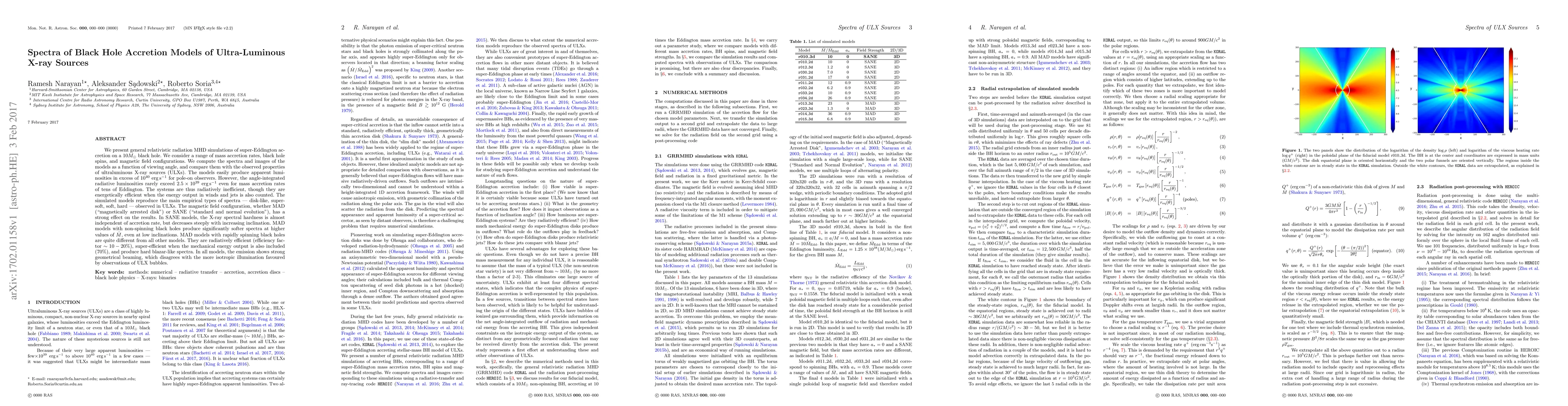 We present general relativistic radiation MHD simulations of super-Eddington accretion on a $10M_\odot$ black hole. We consider a range of mass accretion rates, black hole spins, and magnetic field configurations. We compute the spectra and images of the models as a function of viewing angle, and compare them with the observed properties of ultraluminous X-ray sources (ULXs). The models easily produce apparent luminosities in excess of $10^{40}~{\rm erg\,s^{-1}}$ for pole-on observers. However, the angle-integrated radiative luminosities rarely exceed $2.5\times10^{39}~{\rm erg\,s^{-1}}$ even for mass accretion rates of tens of Eddington. The systems are thus radiatively inefficient, though they are energetically efficient when the energy output in winds and jets is also counted. The simulated models reproduce the main empirical types of spectra --- disk-like, supersoft, soft, hard --- observed in ULXs. The magnetic field configuration, whether MAD ("magnetically arrested disk") or SANE ("standard and normal evolution"), has a strong effect on the results. In SANE models, the X-ray spectral hardness is almost independent of accretion rate, but decreases steeply with increasing inclination. MAD models with non-spinning black holes produce significantly softer spectra at higher values of $\dot{M}$, even at low inclinations. MAD models with rapidly spinning black holes are quite different from all other models. They are radiatively efficient (efficiency factor $\sim10-20\%$), super-efficient when the mechanical energy output is also included ($70\%$), and produce hard blazar-like spectra. In all models, the emission shows strong geometrical beaming, which disagrees with the more isotropic illumination favored by observations of ULX bubbles.