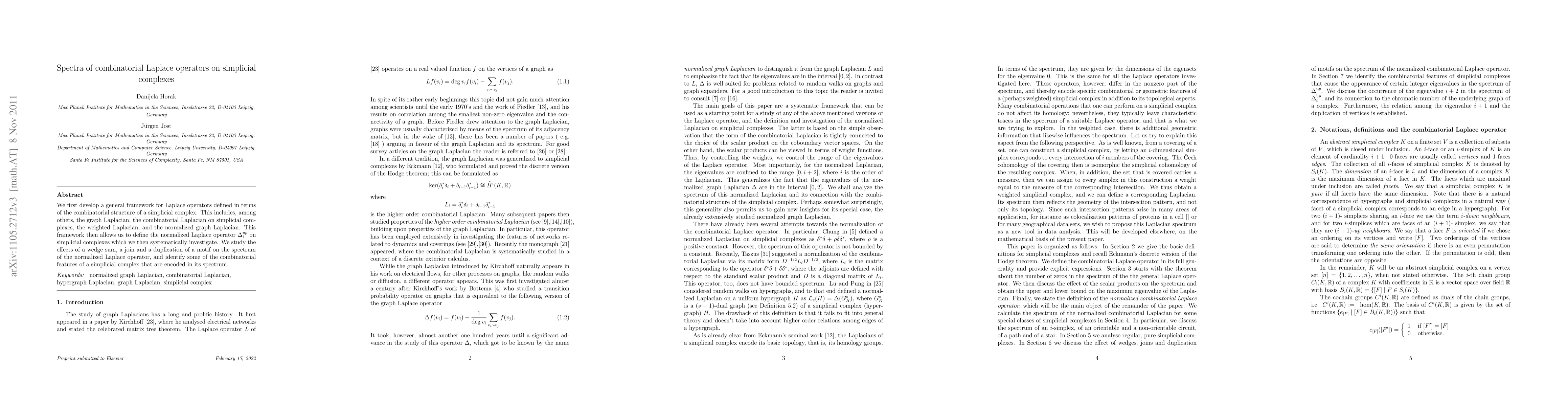This paper develops a framework for combinatorial Laplace operators on simplicial complexes, including various types like the graph Laplacian. It investigates the effects of operations like wedge sums, joins, and duplications on the spectrum of the normalized Laplace operator, revealing how simplicial complex features are encoded in its spectrum.