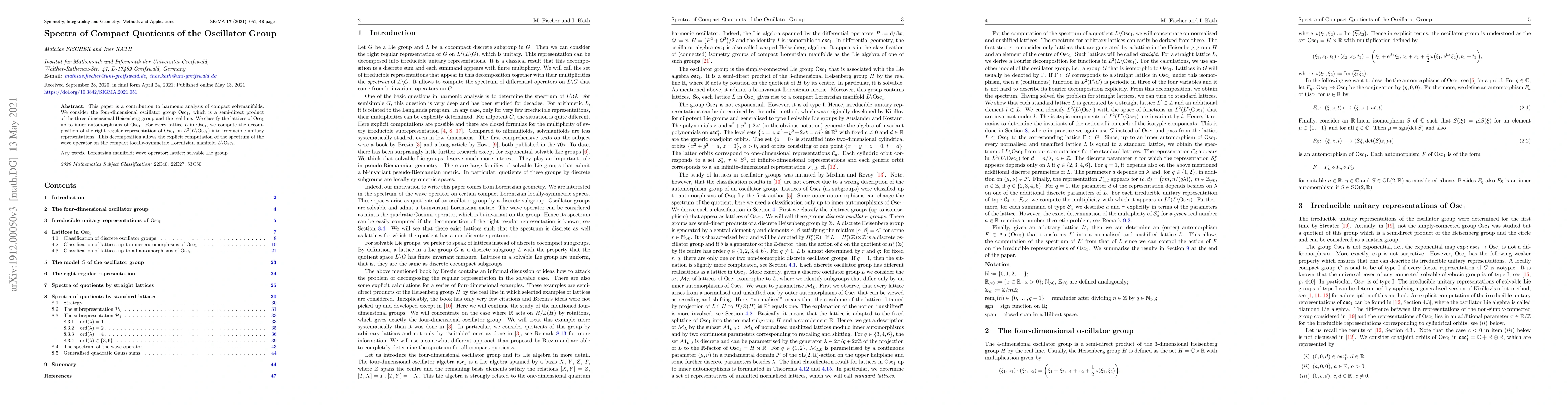 This paper is a contribution to harmonic analysis of compact solvmanifolds. We consider the four-dimensional oscillator group ${\rm Osc}_1$, which is a semi-direct product of the three-dimensional Heisenberg group and the real line. We classify the lattices of ${\rm Osc}_1$ up to inner automorphisms of ${\rm Osc}_1$. For every lattice $L$ in ${\rm Osc}_1$, we compute the decomposition of the right regular representation of ${\rm Osc}_1$ on $L^2(L\backslash{\rm Osc}_1)$ into irreducible unitary representations. This decomposition allows the explicit computation of the spectrum of the wave operator on the compact locally-symmetric Lorentzian manifold $L\backslash {\rm Osc}_1$.