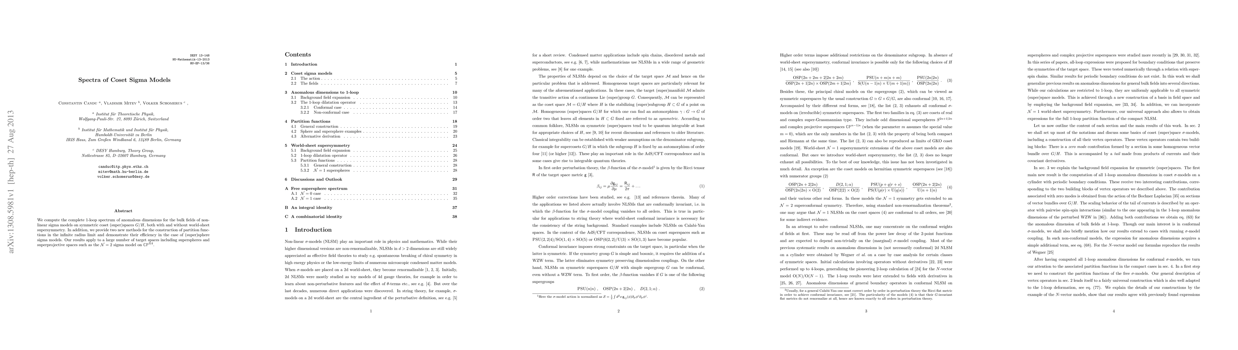 This paper calculates the 1-loop spectrum of anomalous dimensions for non-linear sigma models on symmetric coset spaces, providing new methods for constructing partition functions in the infinite radius limit.