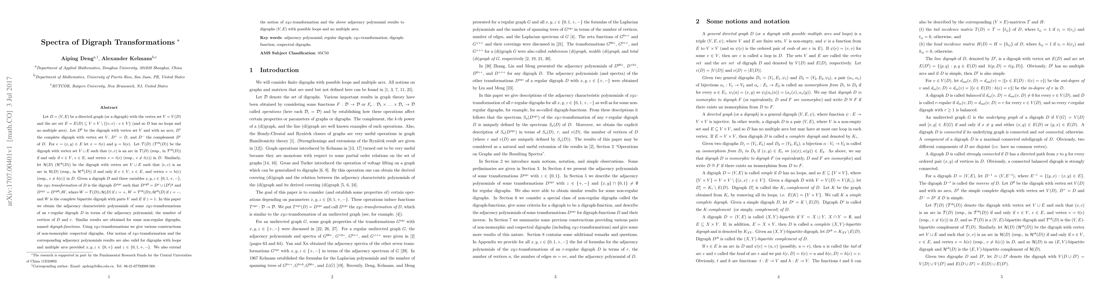 This paper explores transformations (x,y,z) of directed graphs (digraphs), showing that for r-regular digraphs, the adjacency characteristic polynomial of the transformed graph is uniquely defined by the original graph's polynomial and the regularity parameter r. It also provides constructions for non-isomorphic, cospectral digraphs using these transformations.