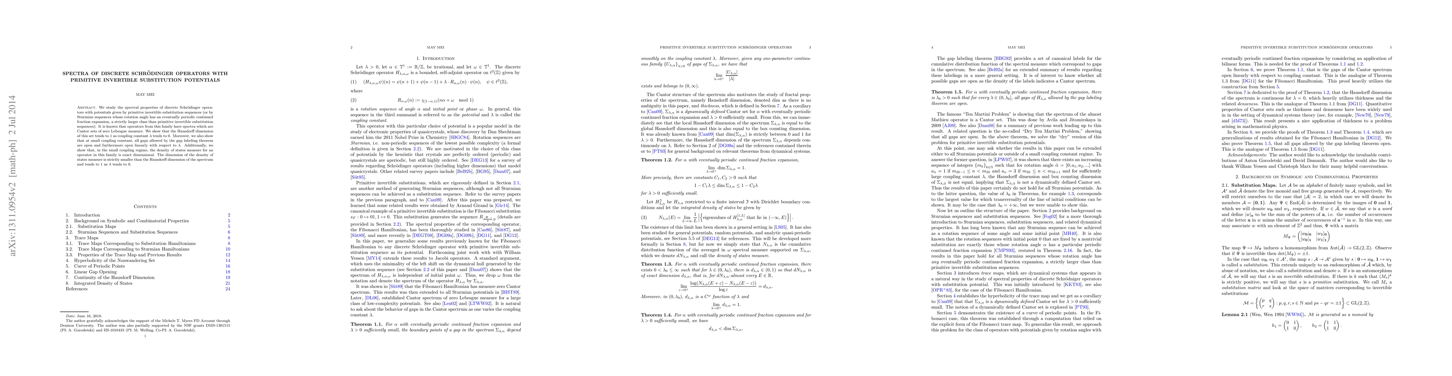 This paper investigates the spectral properties of discrete Schrödinger operators with substitution potentials, showing that their spectra are Cantor sets with Hausdorff dimension approaching 1 as the coupling constant decreases. It also demonstrates that all spectral gaps are open and linearly dependent on the coupling constant, and that the density of states measure has a strictly smaller dimension that also tends to 1 as the coupling constant approaches zero.