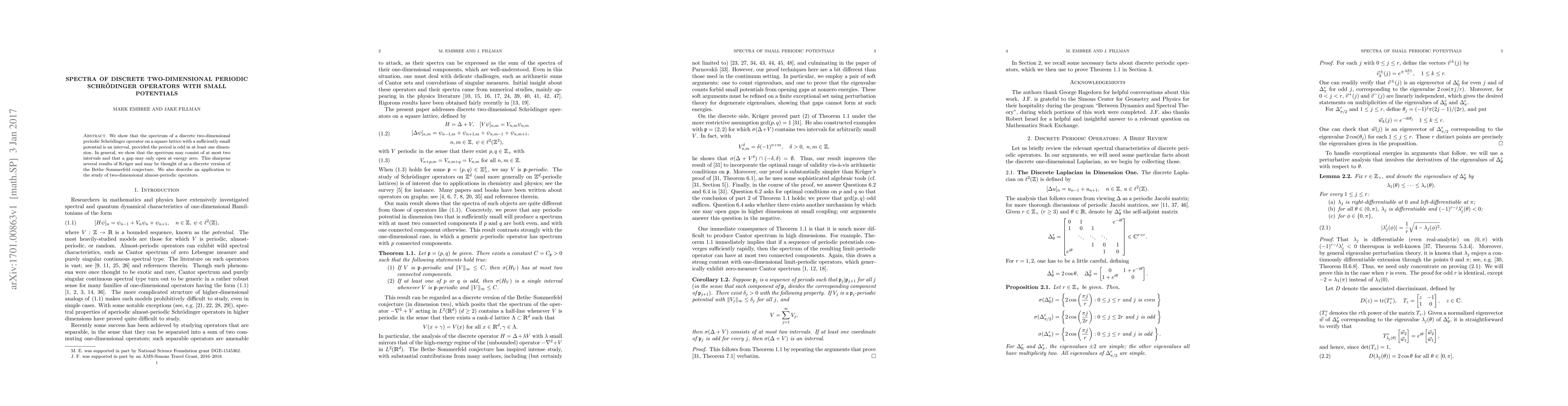 This paper demonstrates that the spectrum of a two-dimensional periodic Schrödinger operator with a small potential is an interval when the period is odd in at least one dimension, potentially consisting of up to two intervals. This result refines previous findings and aligns with the Bethe-Sommerfeld conjecture in a discrete context.