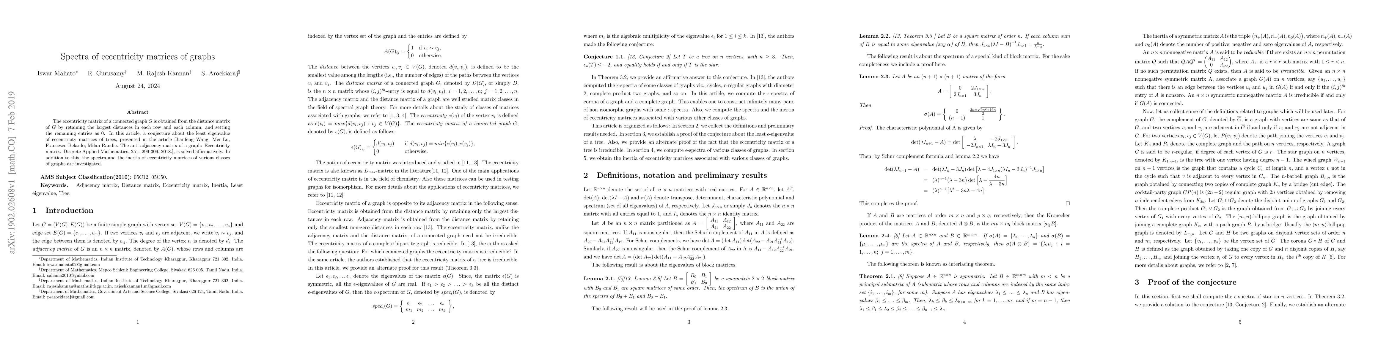 This paper confirms a conjecture regarding the least eigenvalue of eccentricity matrices of trees and explores the spectra and inertia of eccentricity matrices for various graph classes. The eccentricity matrix is derived from the distance matrix by keeping the largest distances and filling others with zeros.