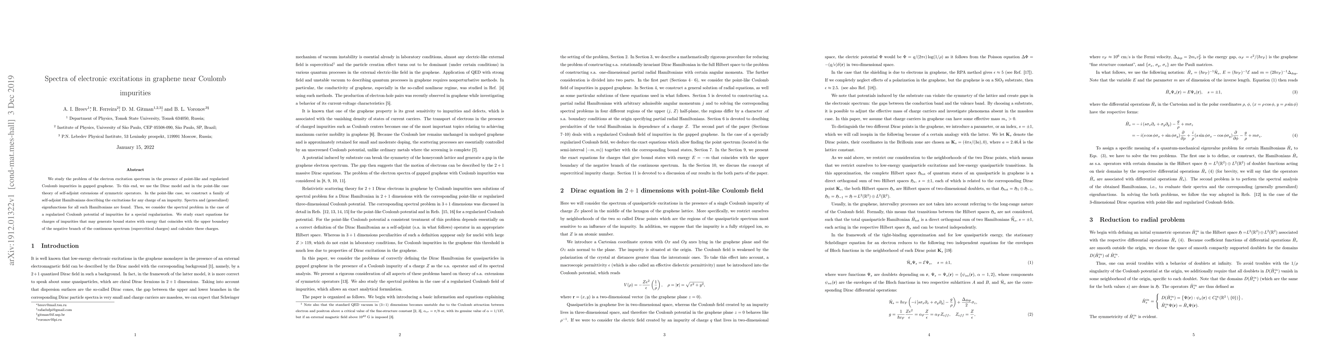 This paper investigates the electronic excitation spectrum in graphene with point-like and regularized Coulomb impurities using the Dirac model. It constructs self-adjoint Hamiltonians for point-like impurities, determining their spectra and eigenfunctions, and analyzes the spectral problem for regularized impurities, identifying supercritical charges that can create bound states.