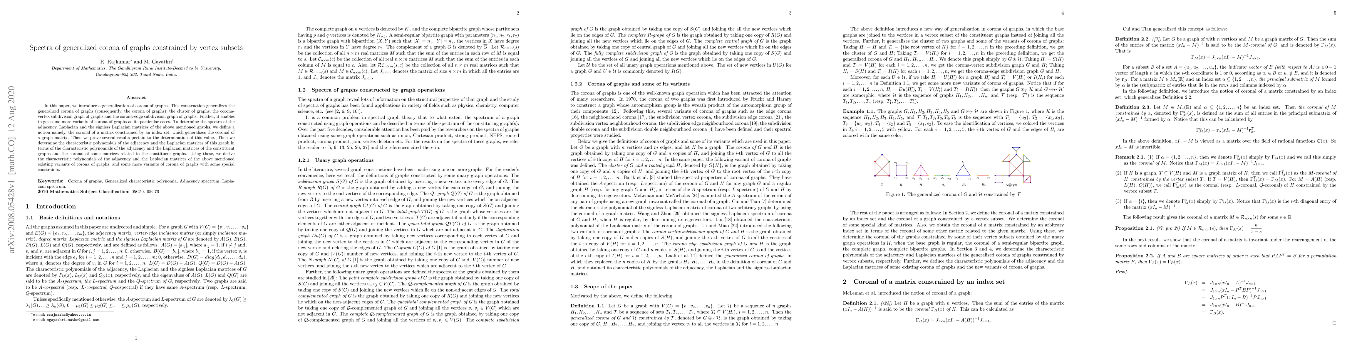 In this paper, we introduce a generalization of corona of graphs. This construction generalizes the generalized corona of graphs (consequently, the corona of graphs), the cluster of graphs, the corona-vertex subdivision graph of graphs and the corona-edge subdivision graph of graphs. Further, it enables to get some more variants of corona of graphs as its particular cases. To determine the spectra of the adjacency, Laplacian and the signless Laplacian matrices of the above mentioned graphs, we define a notion namely, the coronal of a matrix constrained by an index set, which generalizes the coronal of a graph matrix. Then we prove several results pertain to the determination of this value. Then we determine the characteristic polynomials of the adjacency and the Laplacian matrices of this graph in terms of the characteristic polynomials of the adjacency and the Laplacian matrices of the constituent graphs and the coronal of some matrices related to the constituent graphs. Using these, we derive the characteristic polynomials of the adjacency and the Laplacian matrices of the above mentioned existing variants of corona of graphs, and some more variants of corona of graphs with some special constraints.