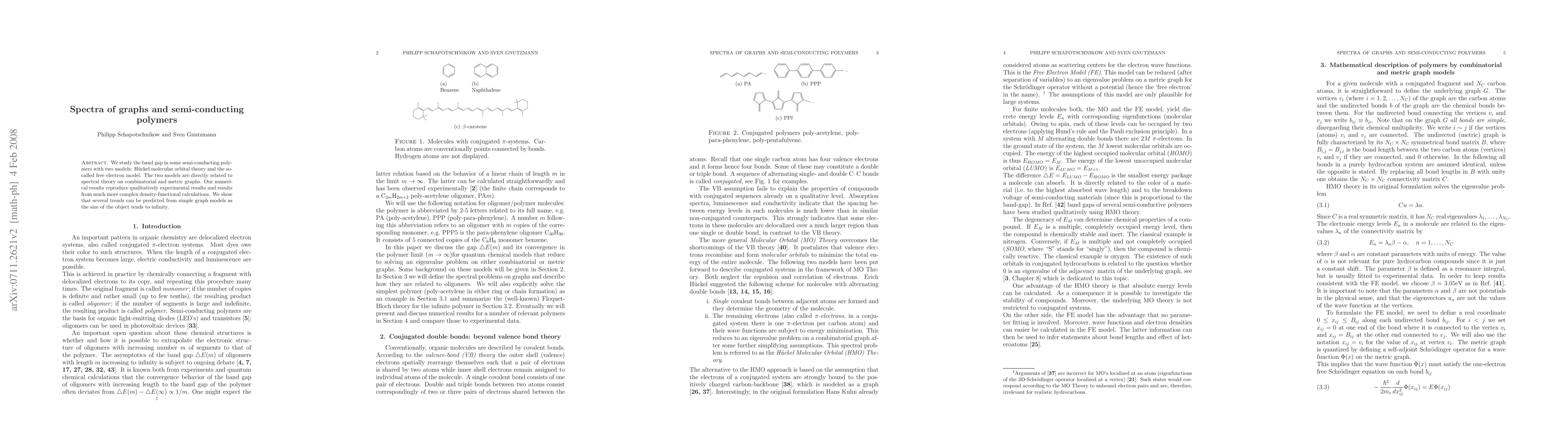 We study the band gap in some semi-conducting polymers with two models: H\"uckel molecular orbital theory and the so-called free electron model. The two models are directly related to spectral theory on combinatorial and metric graphs.