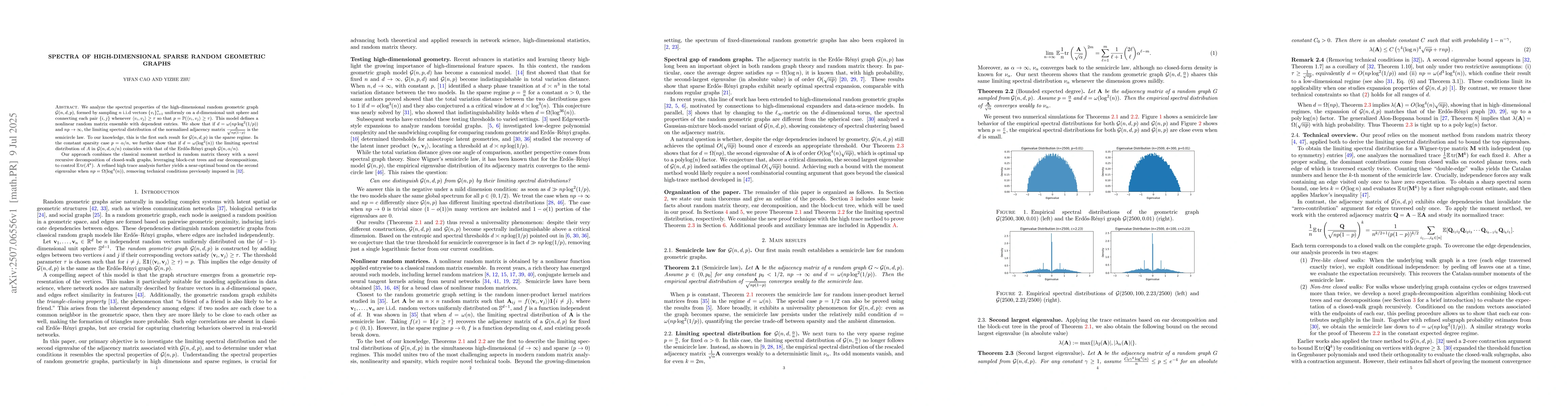 We analyze the spectral properties of the high-dimensional random geometric graph $ G(n, d, p)$, formed by sampling $n$ i.i.d vectors $\{v_i\}_{i=1}^{n}$ uniformly on a $d$-dimensional unit sphere and connecting each pair $\{i,j\}$ whenever $\langle v_i, v_j \rangle \geq \tau$ so that $p=\mathbb P(\langle v_i,v_j\rangle \geq \tau)$. This model defines a nonlinear random matrix ensemble with dependent entries. We show that if $d =\omega( np\log^{2}(1/p))$ and $np\to\infty$, the limiting spectral distribution of the normalized adjacency matrix $\frac{A}{\sqrt{np(1-p)}}$ is the semicircle law. To our knowledge, this is the first such result for $G(n, d, p)$ in the sparse regime. In the constant sparsity case $p=\alpha/n$, we further show that if $d=\omega(\log^2(n))$ the limiting spectral distribution of $A$ in $G(n,d, \alpha/n)$ coincides with that of the Erd\H{o}s-R\'{e}nyi graph $ G(n,\alpha/n)$. Our approach combines the classical moment method in random matrix theory with a novel recursive decomposition of closed walk graphs, leveraging block cut trees and ear decompositions, to control $\mathbb E \mathrm{tr}(A^k)$. A refined high trace analysis further yields a near-optimal bound on the second eigenvalue when $np=\Omega(\log^4 (n))$, removing technical conditions previously imposed in (Liu et al. 2023).