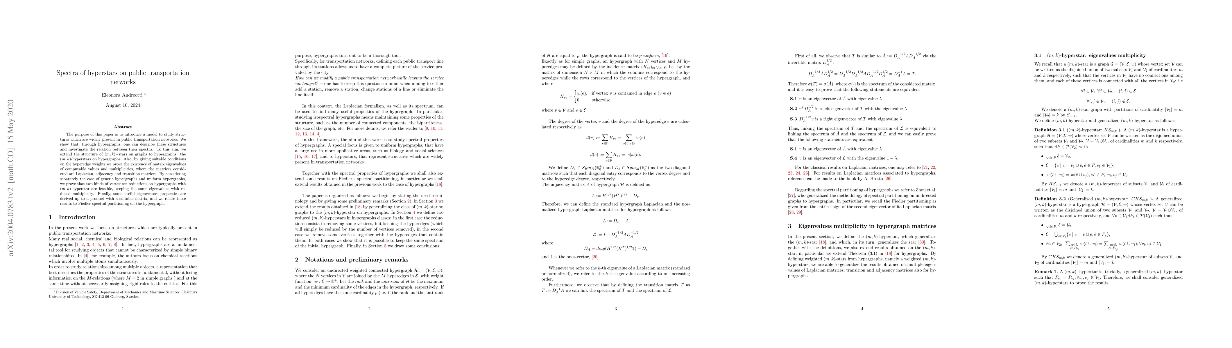 The purpose of this paper is to introduce a model to study structures which are widely present in public transportation networks. We show that, through hypergraphs, one can describe these structures and investigate the relation between their spectra. To this aim, we extend the structure of $(m,k)$-stars on graphs to hypergraphs: the $(m,k)$-hyperstars on hypergraphs. Also, by giving suitable conditions on the hyperedge weights we prove the existence of matrix eigenvalues of computable values and multiplicities, where the matrices considered are Laplacian, adjacency and transition matrices. By considering separately the case of generic hypergraphs and uniform hypergraphs, we prove that two kinds of vertex set reductions on hypergraphs with $(m,k)$-hyperstar are feasible, keeping the same eigenvalues with reduced multiplicity. Finally, some useful eigenvectors properties are derived up to a product with a suitable matrix, and we relate these results to Fiedler spectral partitioning on the hypergraph.