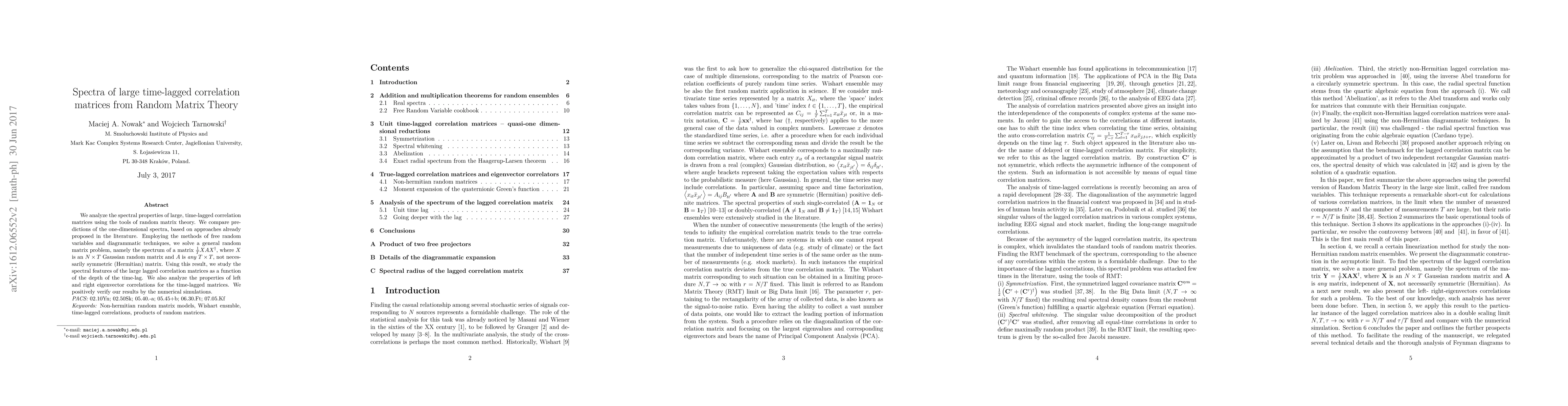 This paper uses random matrix theory to analyze the spectral properties of large, time-lagged correlation matrices. It solves the spectrum of the matrix $\frac{1}{T}XAX^{\dagger}$ using free random variables and diagrammatic techniques, verifying its findings with numerical simulations.