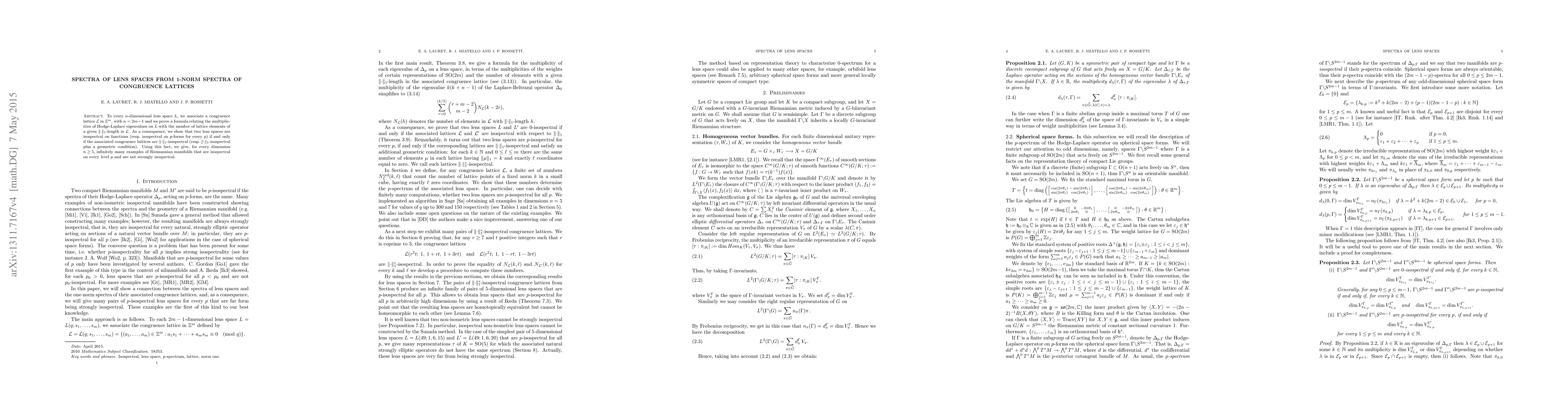 To every $n$-dimensional lens space $L$, we associate a congruence lattice $\mathcal L$ in $\mathbb Z^m$, with $n=2m-1$ and we prove a formula relating the multiplicities of Hodge-Laplace eigenvalues on $L$ with the number of lattice elements of a given $\|\cdot\|_1$-length in $\mathcal L$. As a consequence, we show that two lens spaces are isospectral on functions (resp.\ isospectral on $p$-forms for every $p$) if and only if the associated congruence lattices are $\|\cdot\|_1$-isospectral (resp.\ $\|\cdot\|_1$-isospectral plus a geometric condition). Using this fact, we give, for every dimension $n\ge 5$, infinitely many examples of Riemannian manifolds that are isospectral on every level $p$ and are not strongly isospectral.