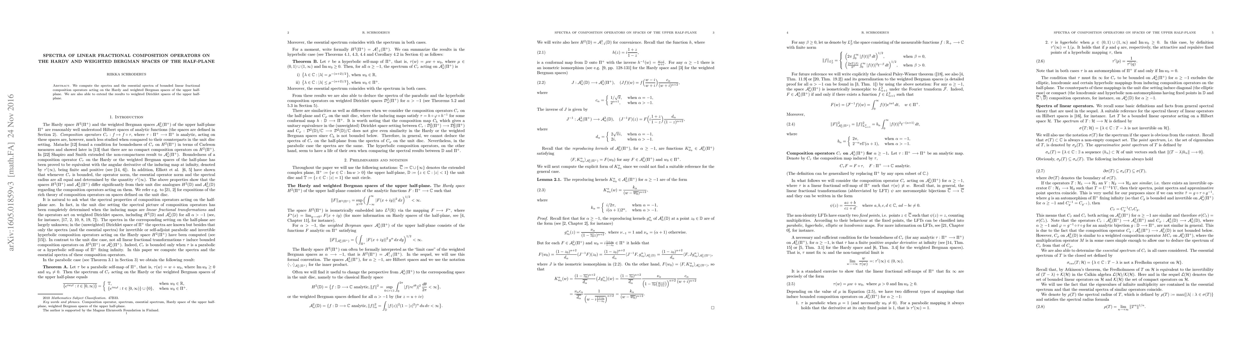 Summary: This paper computes the spectra and essential spectra of linear fractional composition operators on Hardy and weighted Bergman spaces of the upper half-plane, extending the findings to weighted Dirichlet spaces. The results provide insights into the operator's behavior in these function spaces.