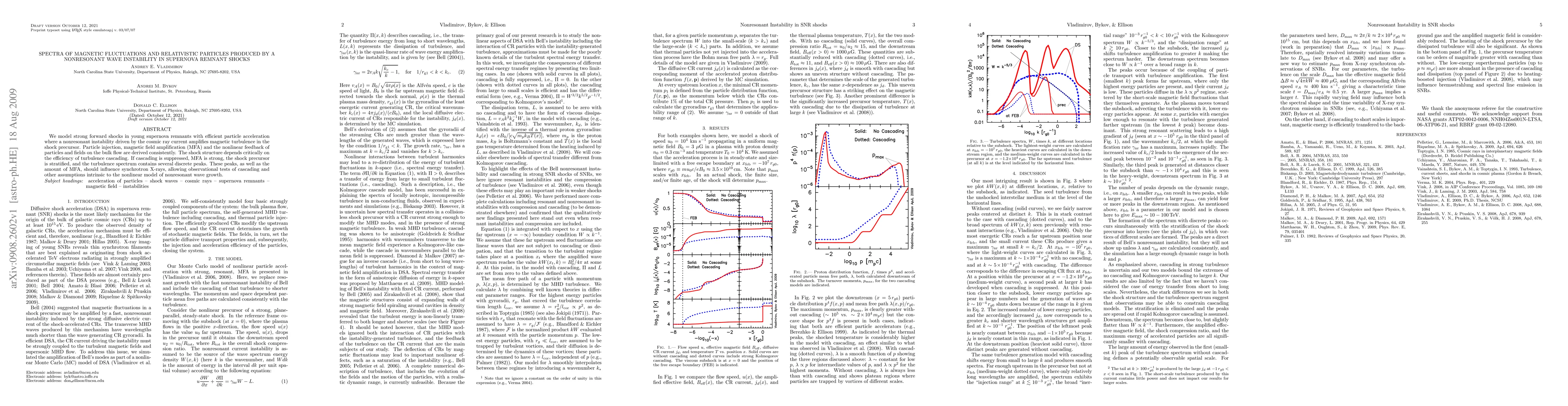 This paper models the magnetic fluctuations and relativistic particles in supernova remnant shocks driven by a nonresonant wave instability, showing how turbulence cascading affects magnetic field amplification and shock structure. The study suggests that the turbulence spectrum's peaks and the degree of magnetic field amplification can be observed in synchrotron X-rays, providing a test for the model's assumptions.