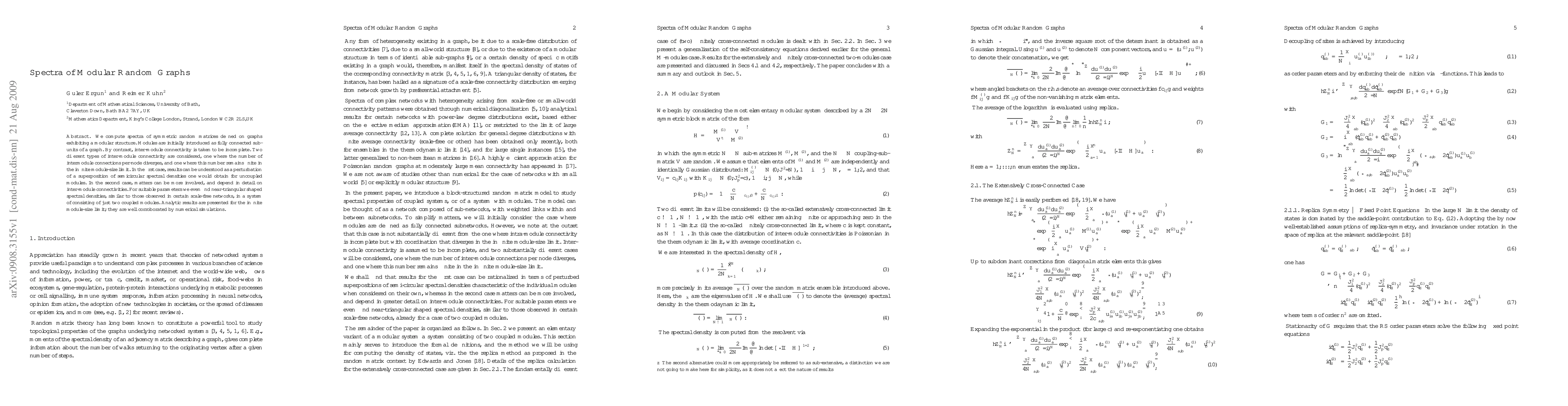We compute spectra of symmetric random matrices defined on graphs exhibiting a modular structure. Modules are initially introduced as fully connected sub-units of a graph. By contrast, inter-module connectivity is taken to be incomplete. Two different types of inter-module connectivity are considered, one where the number of intermodule connections per-node diverges, and one where this number remains finite in the infinite module-size limit. In the first case, results can be understood as a perturbation of a superposition of semicircular spectral densities one would obtain for uncoupled modules. In the second case, matters can be more involved, and depend in detail on inter-module connectivities. For suitable parameters we even find near-triangular shaped spectral densities, similar to those observed in certain scale-free networks, in a system of consisting of just two coupled modules. Analytic results are presented for the infinite module-size limit; they are well corroborated by numerical simulations.