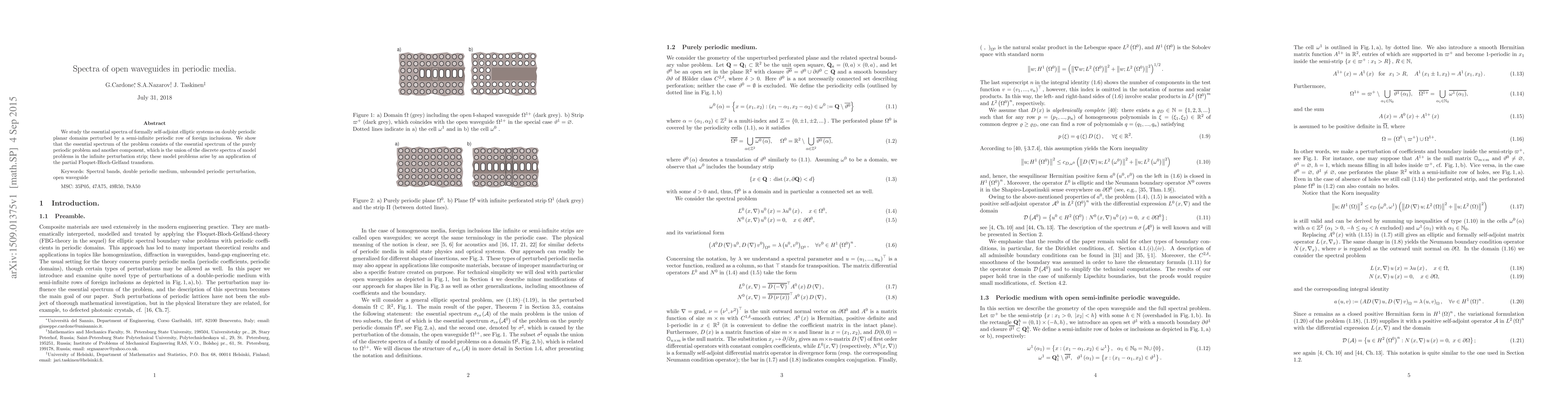 We study the essential spectra of formally self-adjoint elliptic systems on doubly periodic planar domains perturbed by a semi-infinite periodic row of foreign inclusions. We show that the essential spectrum of the problem consists of the essential spectrum of the purely periodic problem and another component, which is the union of the discrete spectra of model problems in the infinite perturbation strip; these model problems arise by an application of the partial Floquet-Bloch-Gelfand transform.