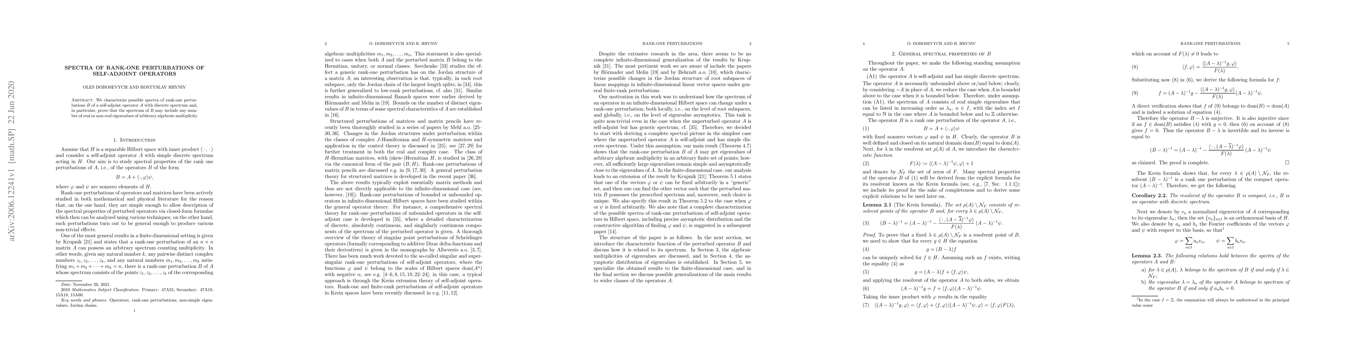 This paper explores the spectral characteristics of rank-one perturbations B of a self-adjoint operator A with discrete spectrum, demonstrating that B can include any number of real or non-real eigenvalues with arbitrary algebraic multiplicities.