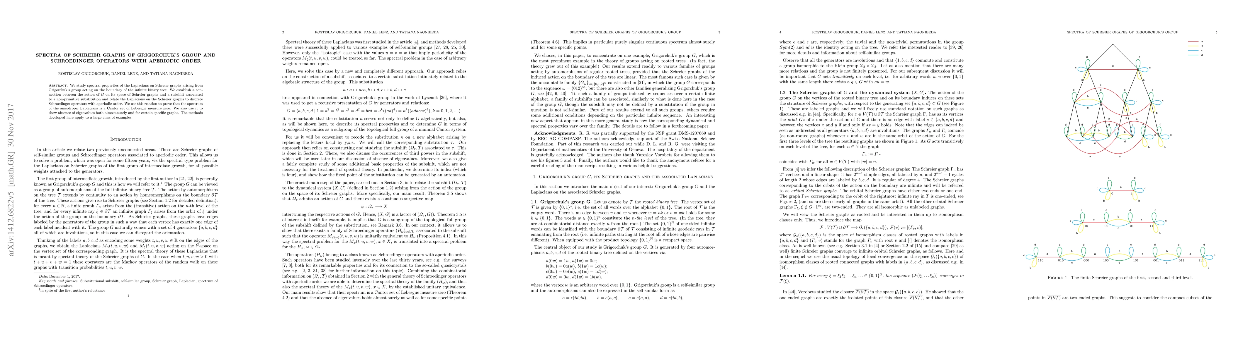 This paper investigates the spectral properties of Laplacians on Schreier graphs derived from Grigorchuk's group acting on the infinite binary tree, establishing a link between these graphs and discrete Schrödinger operators with aperiodic order. The study proves that the spectrum of the anisotropic Laplacians is a Cantor set of Lebesgue measure zero and demonstrates the absence of eigenvalues in almost-sure and specific cases.