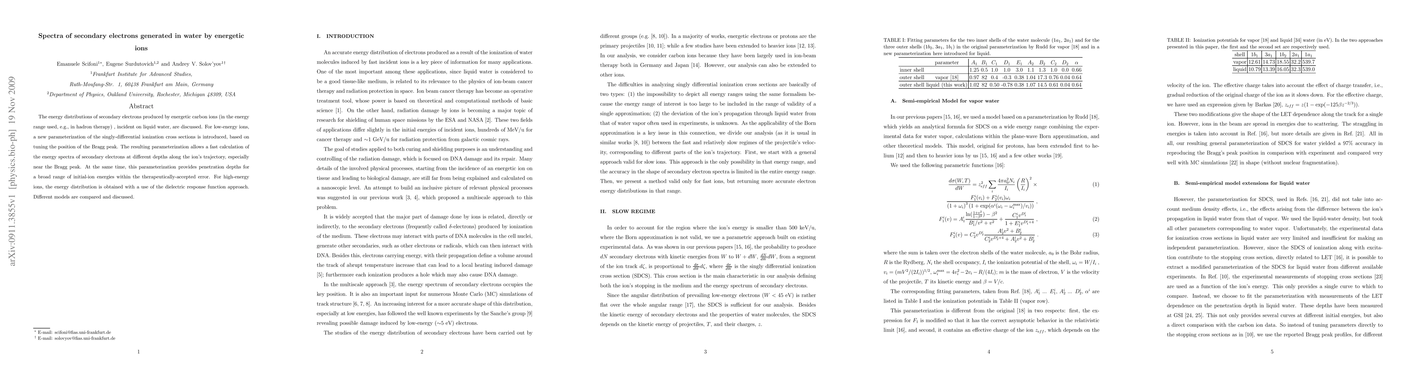 This paper discusses the energy distributions of secondary electrons generated in water by energetic carbon ions, introducing a new parameterization for low-energy ions to calculate spectra near the Bragg peak and comparing dielectric response models for high-energy ions. The study aims to provide accurate penetration depths and energy spectra for therapeutic applications.