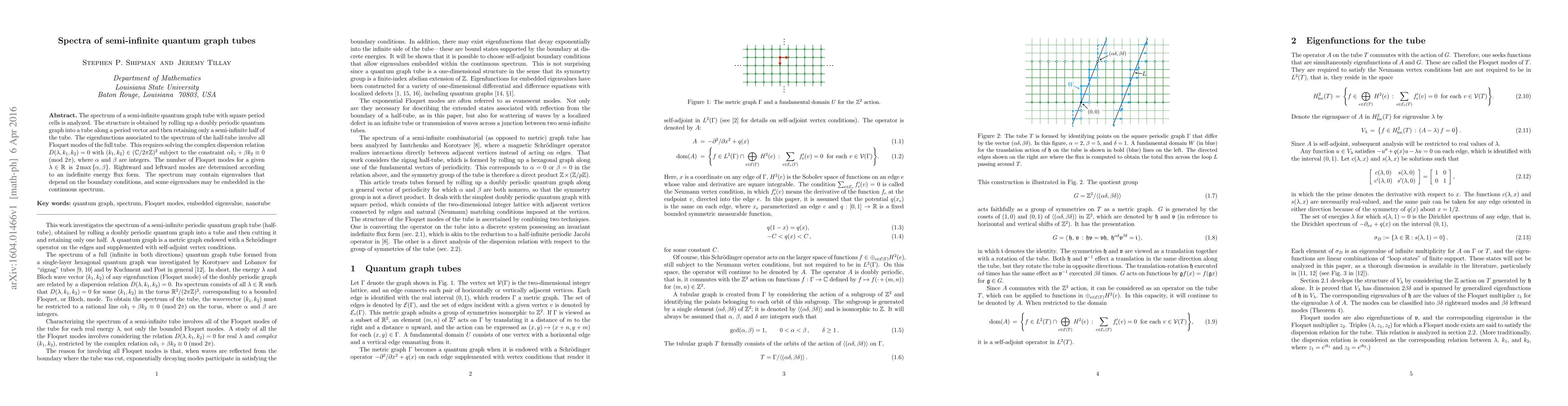 The spectrum of a semi-infinite quantum graph tube with square period cells is analyzed. The structure is obtained by rolling up a doubly periodic quantum graph into a tube along a period vector and then retaining only a semi-infinite half of the tube. The eigenfunctions associated to the spectrum of the half-tube involve all Floquet modes of the full tube. This requires solving the complex dispersion relation $D(\lambda,k_1,k_2)=0$ with $(k_1,k_2)\in(\mathbb{C}/2\pi\mathbb{Z})^2$ subject to the constraint $\alpha k_1 + \beta k_2 \equiv 0$ (mod $2\pi$), where $\alpha$ and $\beta$ are integers. The number of Floquet modes for a given $\lambda\in\mathbb{R}$ is $2\max\left\{ \alpha, \beta \right\}$. Rightward and leftward modes are determined according to an indefinite energy flux form. The spectrum may contain eigenvalues that depend on the boundary conditions, and some eigenvalues may be embedded in the continuous spectrum.