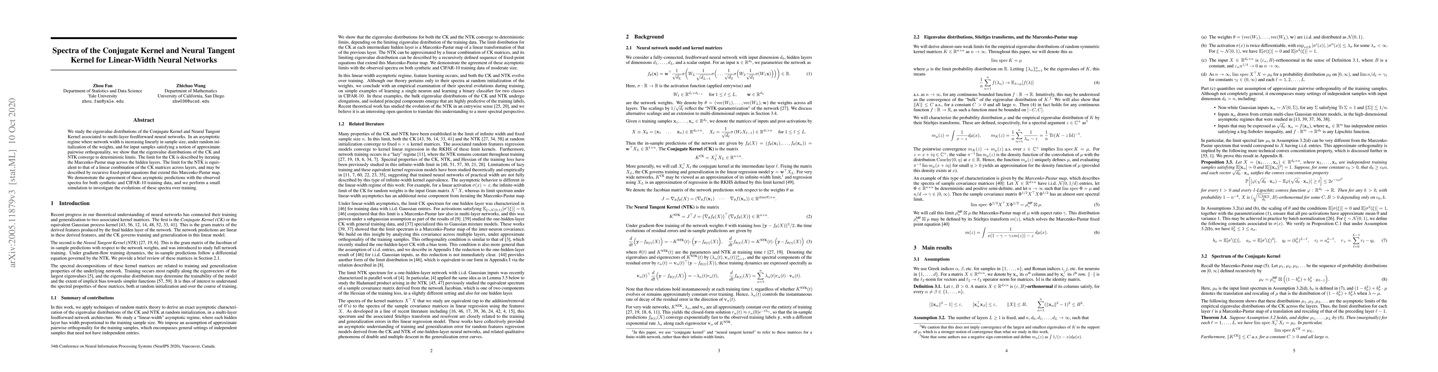 Researchers studied eigenvalue distributions of Conjugate Kernel (CK) and Neural Tangent Kernel (NTK) for linear-width neural networks and found they converge to deterministic limits under certain conditions, aligning with observed spectra in synthetic and CIFAR-10 data.