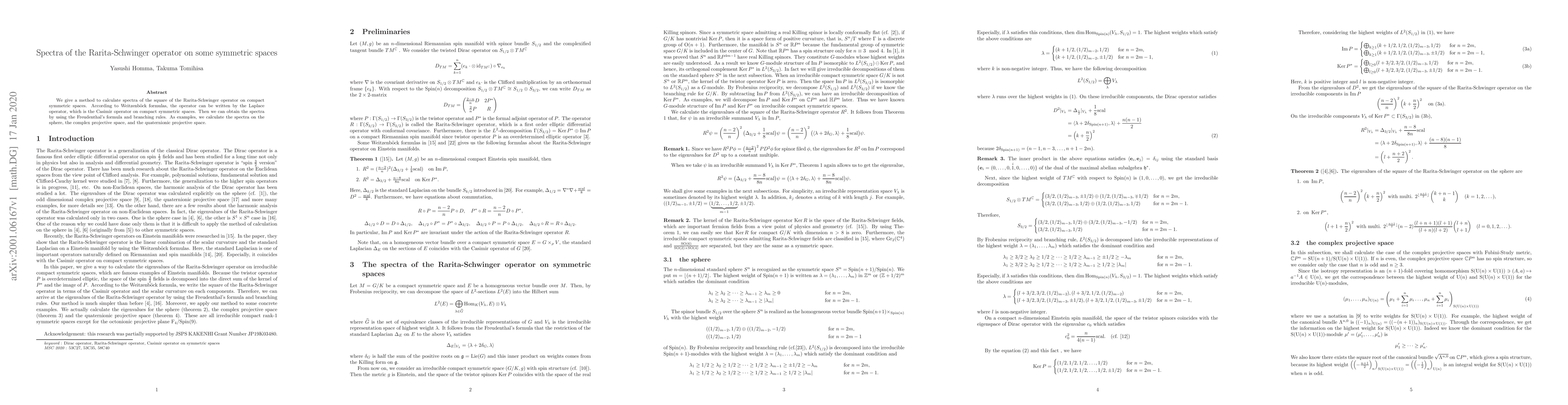 This paper presents a method to determine the spectra of the Rarita-Schwinger operator squared on compact symmetric spaces, utilizing Weitzenböck's formulas, Freudenthal's formula, and branching rules, and provides examples for the sphere, complex projective space, and quaternionic projective space.