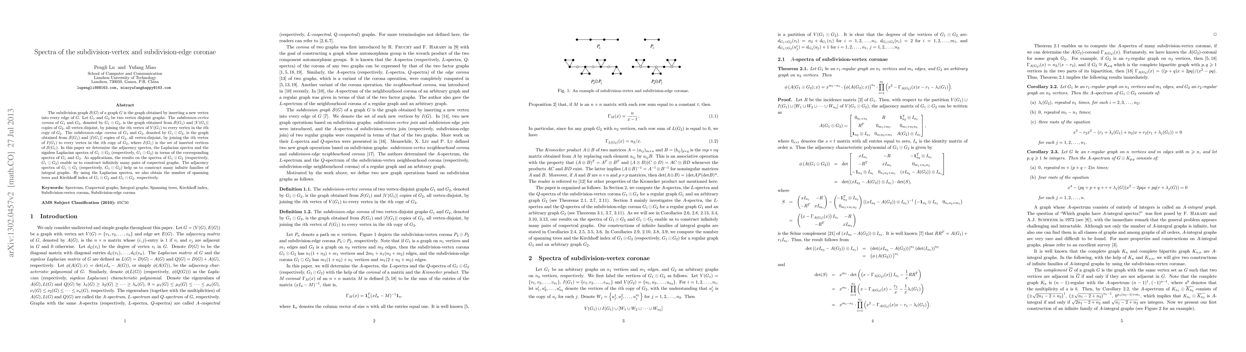 The subdivision graph $\mathcal{S}(G)$ of a graph $G$ is the graph obtained by inserting a new vertex into every edge of $G$. Let $G_1$ and $G_2$ be two vertex disjoint graphs. The \emph{subdivision-vertex corona} of $G_1$ and $G_2$, denoted by $G_1\odot G_2$, is the graph obtained from $\mathcal{S}(G_1)$ and $|V(G_1)|$ copies of $G_2$, all vertex-disjoint, by joining the $i$th vertex of $V(G_1)$ to every vertex in the $i$th copy of $G_2$. The \emph{subdivision-edge corona} of $G_1$ and $G_2$, denoted by $G_1\circleddash G_2$, is the graph obtained from $\mathcal{S}(G_1)$ and $|I(G_1)|$ copies of $G_2$, all vertex-disjoint, by joining the $i$th vertex of $I(G_1)$ to every vertex in the $i$th copy of $G_2$, where $I(G_1)$ is the set of inserted vertices of $\mathcal{S}(G_1)$. In this paper we determine the adjacency spectra, the Laplacian spectra and the signless Laplacian spectra of $G_1\odot G_2$ (respectively, $G_1\circleddash G_2$) in terms of the corresponding spectra of $G_1$ and $G_2$. As applications, the results on the spectra of $G_1\odot G_2$ (respectively, $G_1\circleddash G_2$) enable us to construct infinitely many pairs of cospectral graphs. The adjacency spectra of $G_1\odot G_2$ (respectively, $G_1\circleddash G_2$) help us to construct many infinite families of integral graphs. By using the Laplacian spectra, we also obtain the number of spanning trees and Kirchhoff index of $G_1\odot G_2$ and $G_1\circleddash G_2$, respectively.