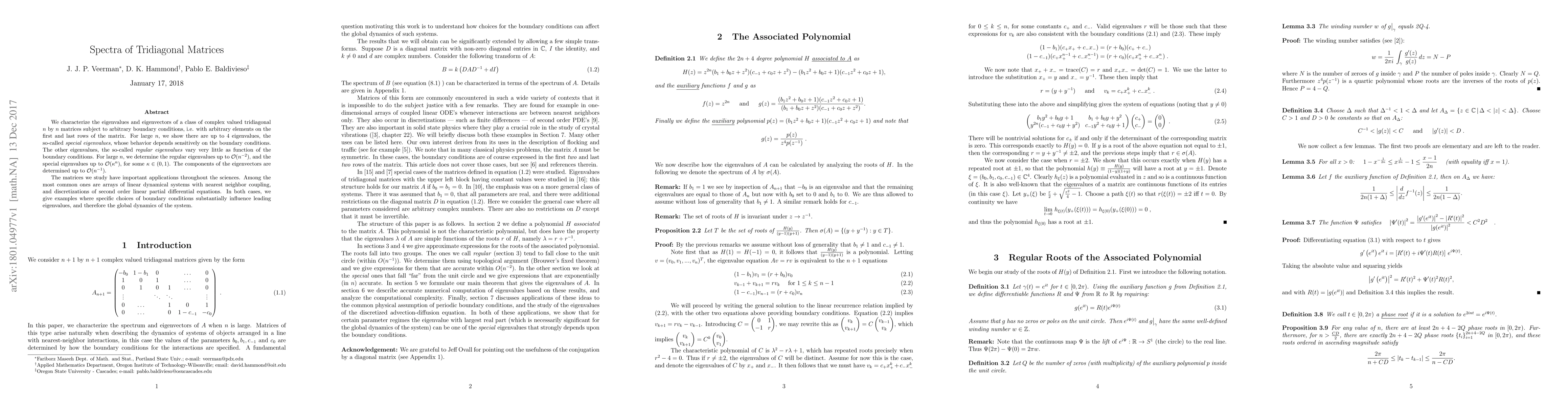 We characterize the eigenvalues and eigenvectors of a class of complex valued tridiagonal $n$ by $n$ matrices subject to arbitrary boundary conditions, i.e. with arbitrary elements on the first and last rows of the matrix. %By boundary conditions, we mean the first and last row of the matrix. For large $n$, we show there are up to $4$ eigenvalues, the so-called \emph{special eigenvalues}, whose behavior depends sensitively on the boundary conditions. The other eigenvalues, the so-called \emph{regular eigenvalues} vary very little as function of the boundary conditions. For large $n$, we determine the regular eigenvalues up to ${\cal O}(n^{-2})$, and the special eigenvalues up to ${\cal O}(\kappa^n)$, for some $\kappa\in (0,1)$. The components of the eigenvectors are determined up to ${\cal O}(n^{-1})$. The matrices we study have important applications throughout the sciences. Among the most common ones are arrays of linear dynamical systems with nearest neighbor coupling, and discretizations of second order linear partial differential equations. In both cases, we give examples where specific choices of boundary conditions substantially influence leading eigenvalues, and therefore the global dynamics of the system.