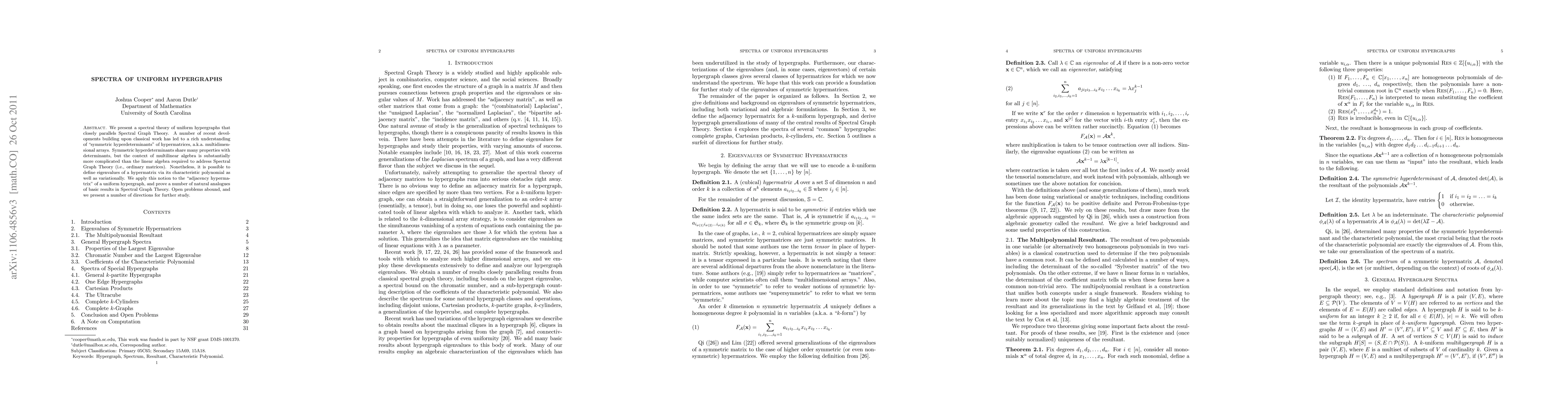 We present a spectral theory of hypergraphs that closely parallels Spectral Graph Theory. A number of recent developments building upon classical work has led to a rich understanding of "hyperdeterminants" of hypermatrices, a.k.a. multidimensional arrays. Hyperdeterminants share many properties with determinants, but the context of multilinear algebra is substantially more complicated than the linear algebra required to address Spectral Graph Theory (i.e., ordinary matrices). Nonetheless, it is possible to define eigenvalues of a hypermatrix via its characteristic polynomial as well as variationally. We apply this notion to the "adjacency hypermatrix" of a uniform hypergraph, and prove a number of natural analogues of basic results in Spectral Graph Theory. Open problems abound, and we present a number of directions for further study.