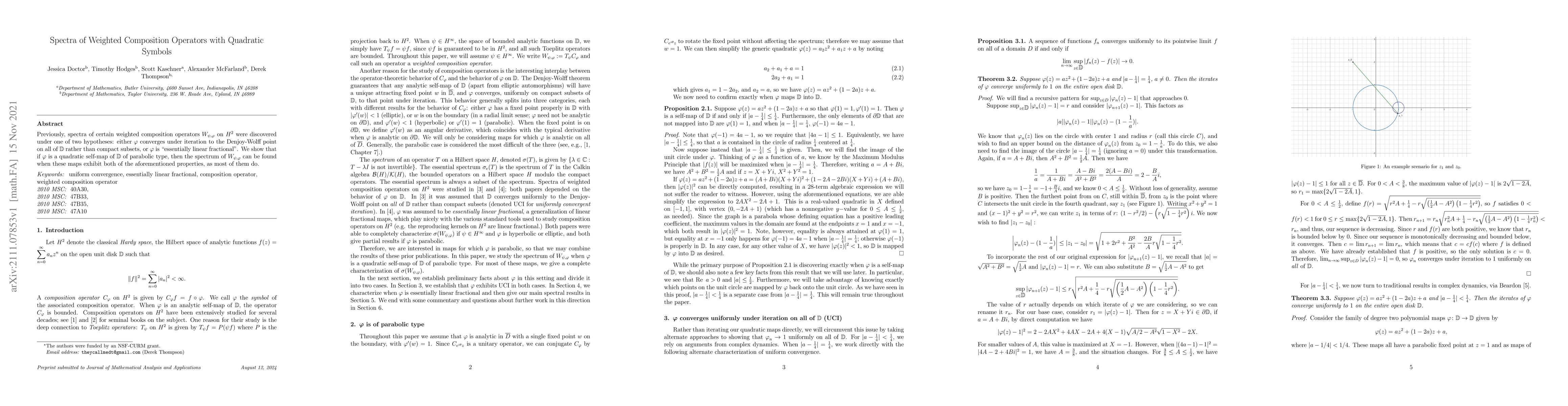 Previously, spectra of certain weighted composition operators on the Hardy Space were discovered under one of two hypotheses: either the compositional symbol converges under iteration to the Denjoy-Wolff point on all of the open disk rather than compact subsets, or the compositional symbol is "essentially linear fractional". We show that if the symbol is a quadratic self-map of the disk of parabolic type, then the spectrum of the weighted composition operators can be found when these maps exhibit both of the aforementioned properties, and most of them do.