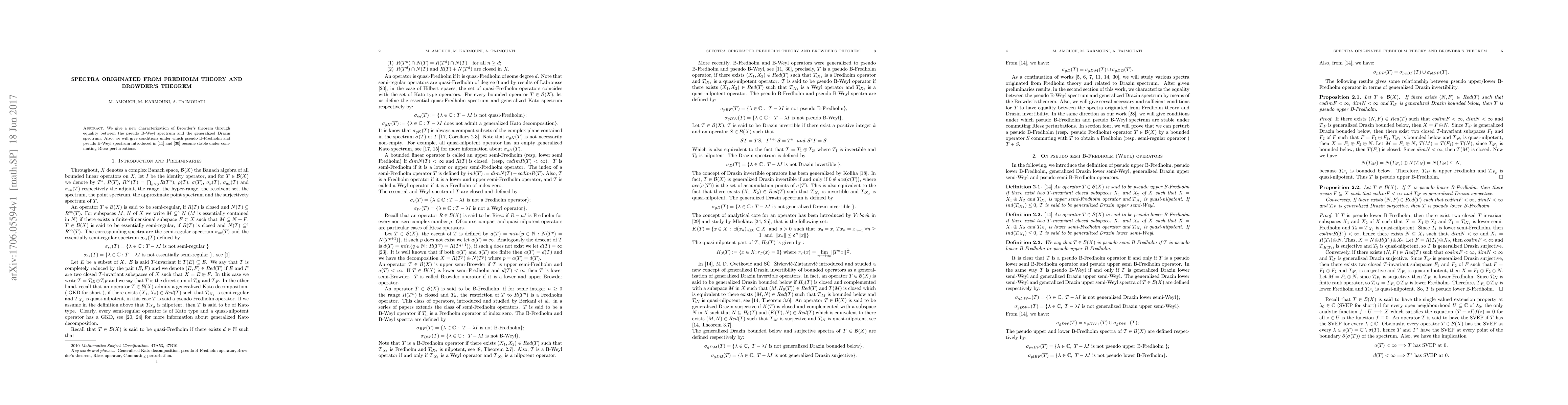 We give a new characterization of Browders theorem through equality between the pseudo B-Weyl spectrum and the generalized Drazin spectrum. Also, we will give conditions under which pseudo B-Fredholm and pseudo B-Weyl spectrum introduced in [11] and [30] become stable under commuting Riesz perturbations.