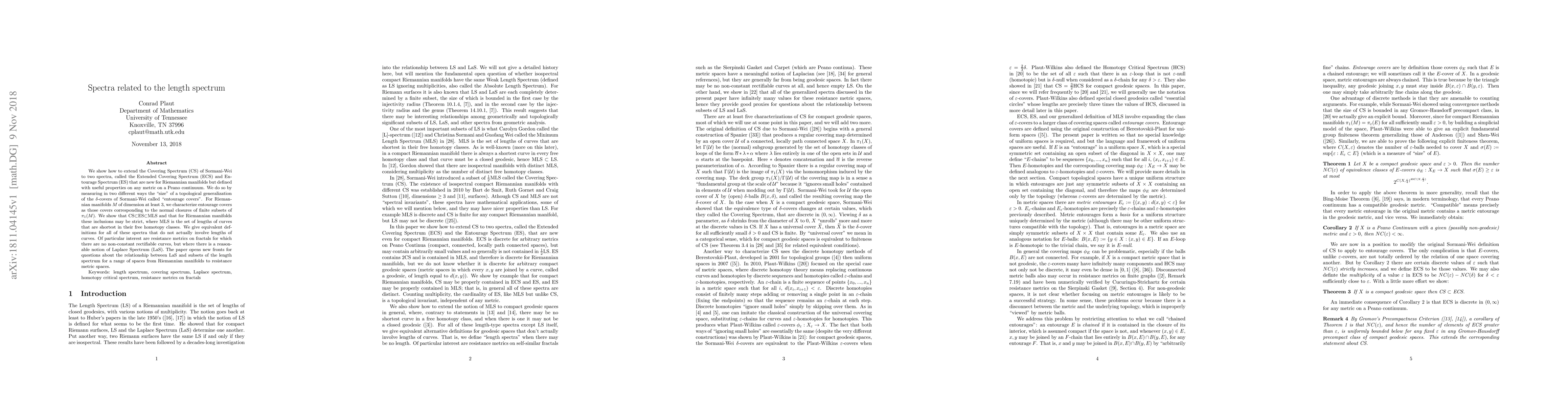 We show how to extend the Covering Spectrum (CS) of Sormani-Wei to two spectra, called the Extended Covering Spectrum (ECS) and Entourage Spectrum (ES) that are new for Riemannian manifolds but defined with useful properties on any metric on a Peano continuum. We do so by measuring in two different ways the "size" of a topological generalization of the $\delta$-covers of Sormani-Wei called "entourage covers". For Riemannian manifolds $M$ of dimension at least 3, we characterize entourage covers as those covers corresponding to the normal closures of finite subsets of $\pi_{1}(M)$. We show that CS$\subset$ES$\subset$MLS and that for Riemannian manifolds these inclusions may be strict, where MLS is the set of lengths of curves that are shortest in their free homotopy classes. We give equivalent definitions for all of these spectra that do not actually involve lengths of curves. Of particular interest are resistance metrics on fractals for which there are no non-constant rectifiable curves, but where there is a reasonable notion of Laplace Spectrum (LaS). The paper opens new fronts for questions about the relationship between LaS and subsets of the length spectrum for a range of spaces from Riemannian manifolds to resistance metric spaces.