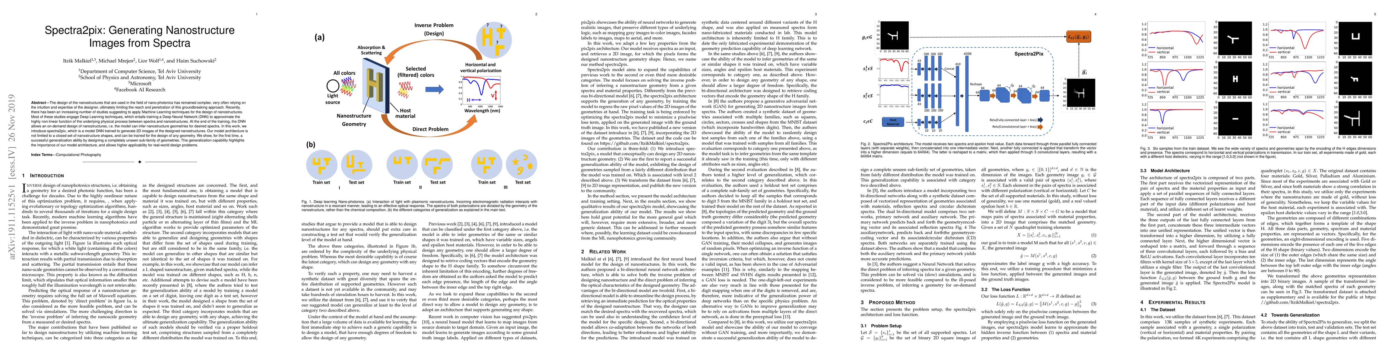 The design of the nanostructures that are used in the field of nano-photonics has remained complex, very often relying on the intuition and expertise of the designer, ultimately limiting the reach and penetration of this groundbreaking approach. Recently, there has been an increasing number of studies suggesting to apply Machine Learning techniques for the design of nanostructures. Most of these studies engage Deep Learning techniques, which entails training a Deep Neural Network (DNN) to approximate the highly non-linear function of the underlying physical process between spectra and nanostructures. At the end of the training, the DNN allows an on-demand design of nanostructures, i.e. the model can infer nanostructure geometries for desired spectra. In this work, we introduce spectra2pix, which is a model DNN trained to generate 2D images of the designed nanostructures. Our model architecture is not limited to a closed set of nanostructure shapes, and can be trained for the design of any geometry. We show, for the first time, a successful generalization ability by designing a completely unseen sub-family of geometries. This generalization capability highlights the importance of our model architecture, and allows higher applicability for real-world design problems.