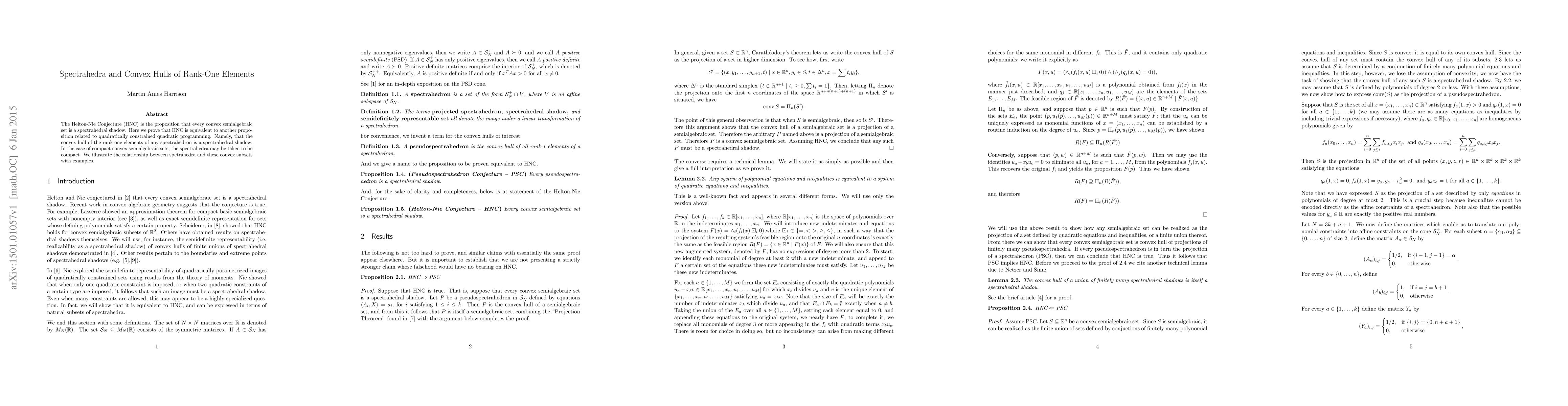 The Helton-Nie Conjecture (HNC) is the proposition that every convex semialgebraic set is a spectrahedral shadow. Here we prove that HNC is equivalent to another propo- sition related to quadratically constrained quadratic programming. Namely, that the convex hull of the rank-one elements of any spectrahedron is a spectrahedral shadow. In the case of compact convex semialgebraic sets, the spectrahedra may be taken to be compact. We illustrate the relationship between spetrahedra and these convex subsets with examples.