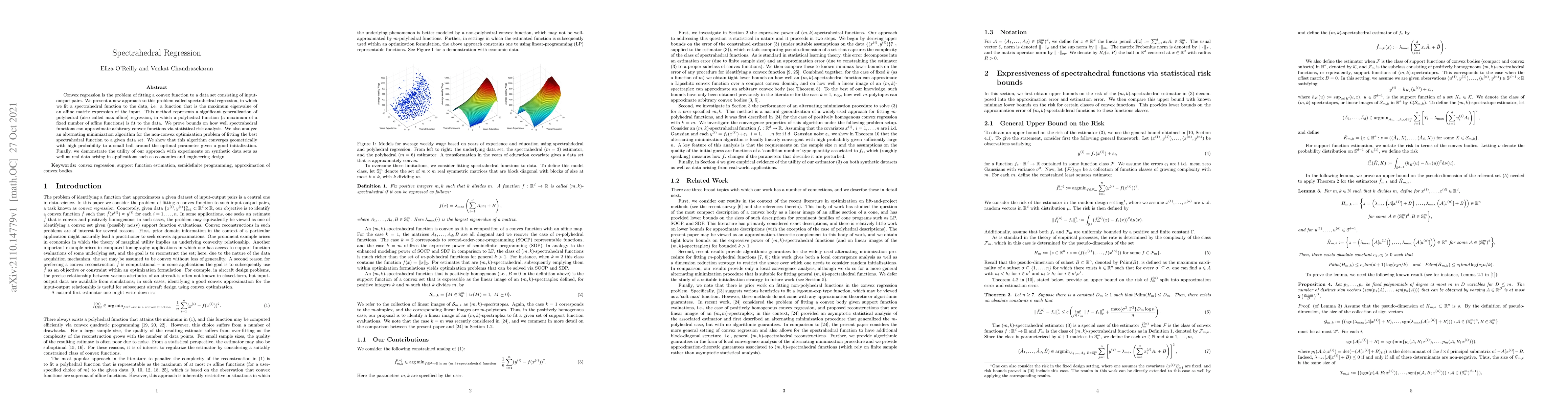Spectrahedral regression fits spectrahedral functions—functions that are the maximum eigenvalue of an affine matrix expression—to data, generalizing polyhedral regression. The authors prove approximation bounds and analyze an alternating minimization algorithm that converges geometrically to the optimal solution.
